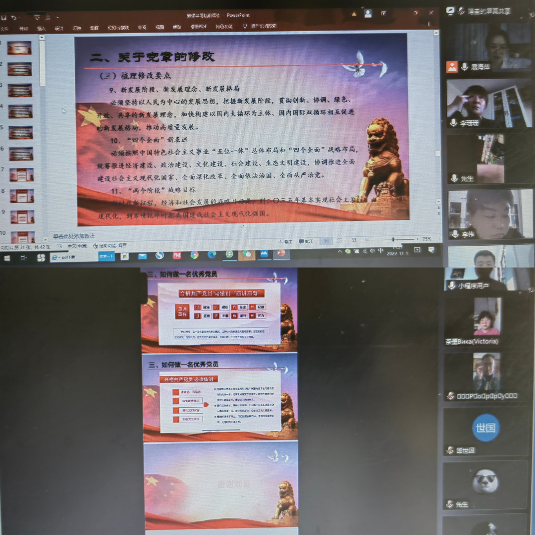 近日,新絲路公司黨支部線上開展了“黨的二十大報告專題學(xué)習(xí)”主題黨日活動和新黨章學(xué)習(xí)培訓(xùn),充分學(xué)習(xí)黨的二十大召開重要意義和會議精神,把全員思想和行動統(tǒng)一到黨的二十大精神上,把黨的二十大精神貫徹落實到各項工作中,為保障新絲路公司全年任務(wù)目標(biāo)圓滿完成和推進(jìn)隴神戎發(fā)實現(xiàn)高質(zhì)量發(fā)展賦能。