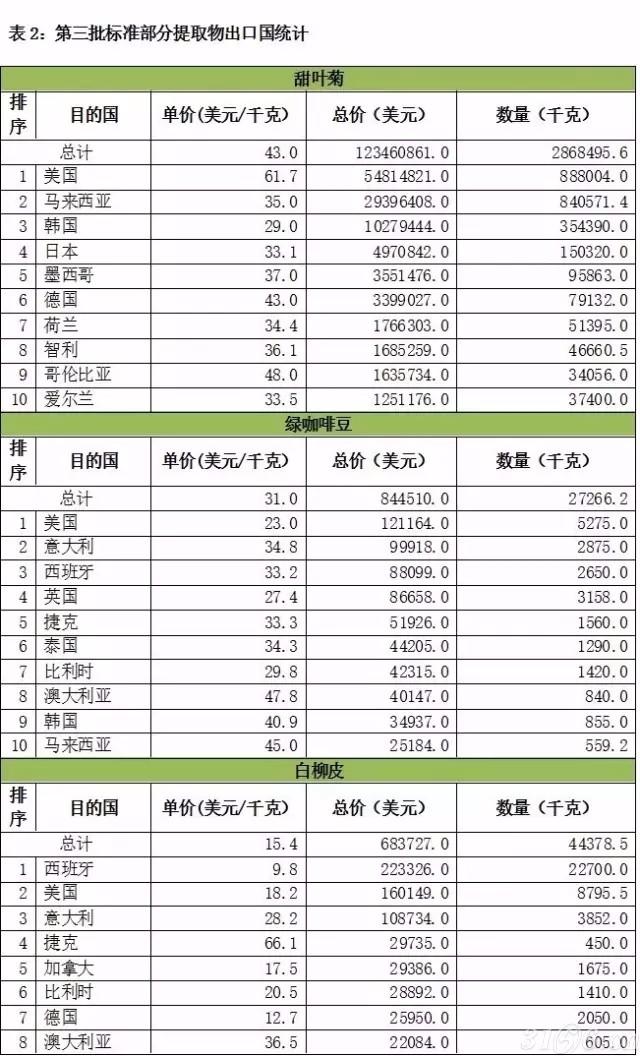 此外記者留意到,2016年,我國(guó)提取物出口排名前十的品種包括:甜菊提取物、桉葉油、薄荷醇、甘草提取物、萬壽菊提取物、辣椒色素、越橘提取物、蕓香苷及其衍生物、橙皮苷、桂油等。但桉葉油、薄荷醇、甘草,提取物等這些排名靠前的品種還不在目前25個(gè)已有標(biāo)準(zhǔn)的名單中。