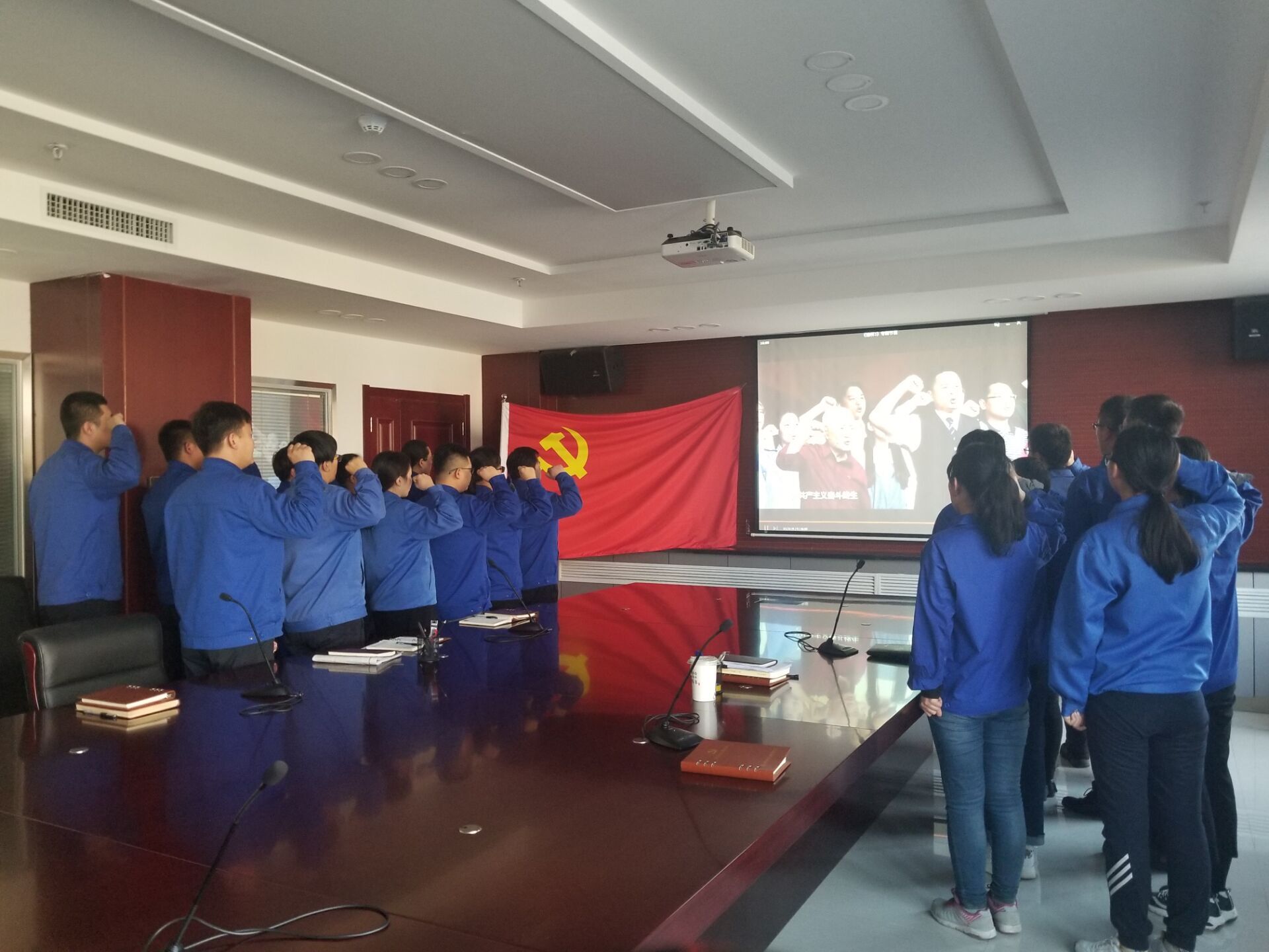最后,生產(chǎn)黨支部全體黨員再次面向黨旗,在影片中榜樣的帶領(lǐng)下鄭重宣誓,重溫入黨誓詞,重尋自己入黨時的初心。