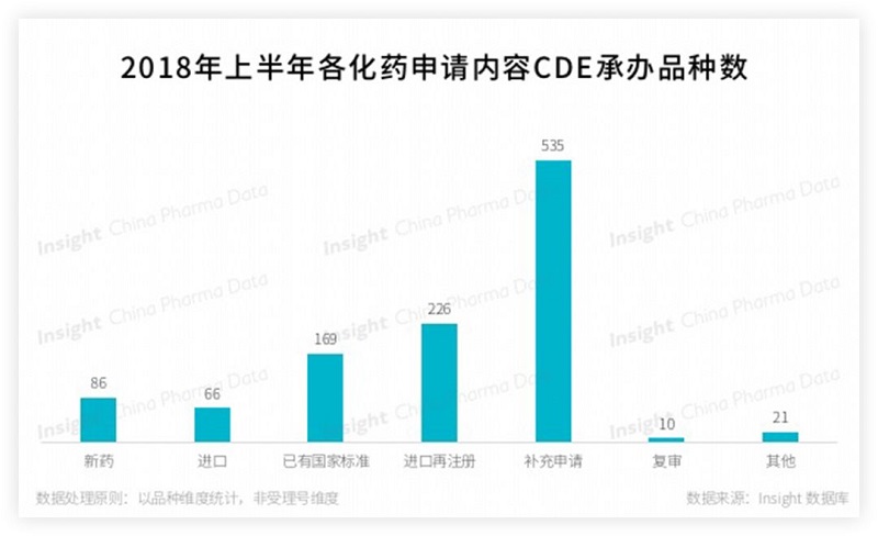 補充申請是申報類型中最為主要的部分,同時,值得注意的是,今年上半年新藥申報數(shù)量均超過進口藥數(shù)量。