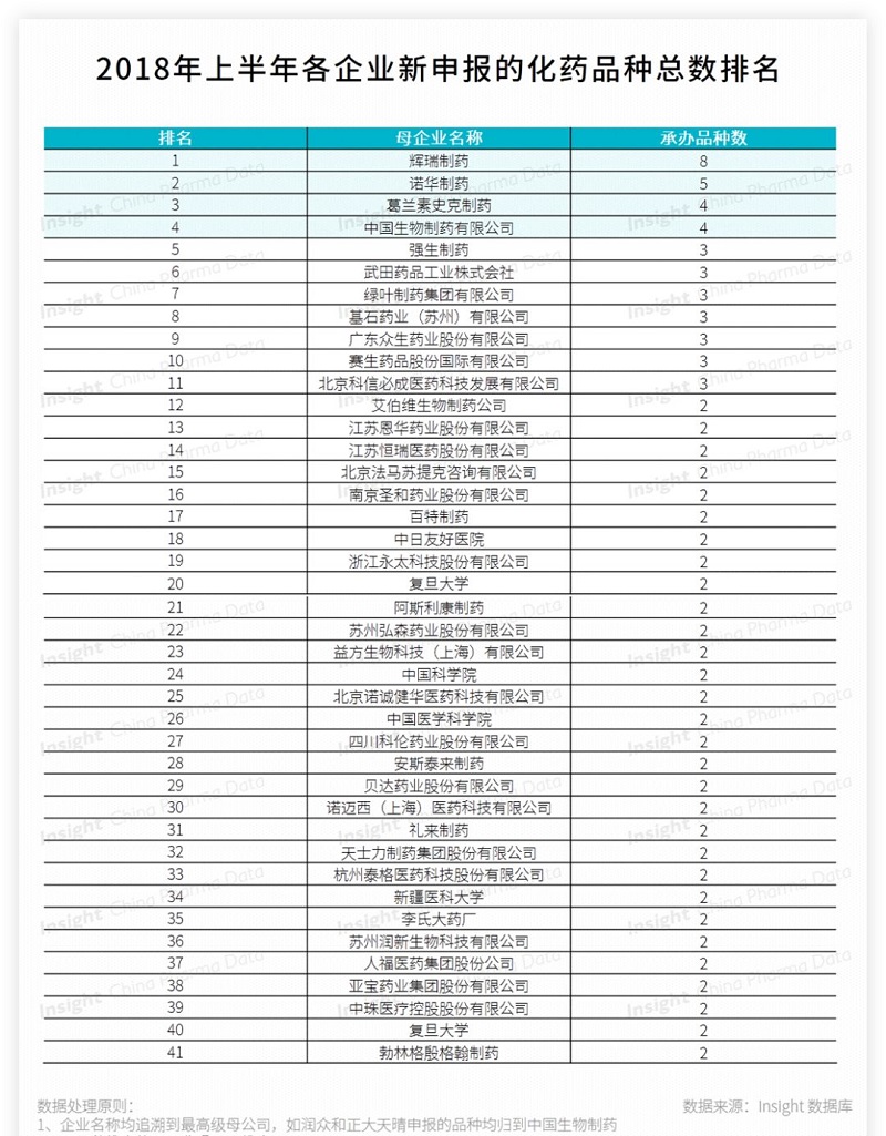 上半年申報品種數(shù)量企業(yè)排名中,輝瑞拔得頭籌,而 2017 年排名第一的諾華今年排名第二。