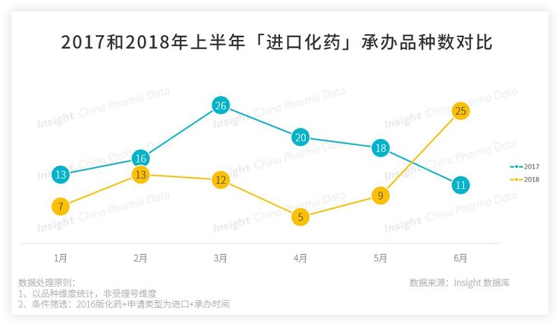 今年上半年進口藥申報品種數(shù)量為 71 個,在 5 月,2018 年上半年進口化藥承辦數(shù)量前均低于 2017 年同期,2018 年 6 月藥品申報出現(xiàn)了一個小高峰,該月進口化藥申報品種數(shù)量為 25 個,這可能與今年陸續(xù)出臺的調(diào)整進口藥品注冊管理有關(guān)事項的決定有關(guān),在政策上是鼓勵進口藥申報的。