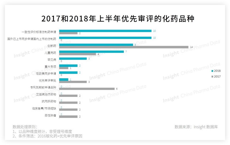 相比去年,今年在歐美同步申請、重大專項、罕見病、兒童用藥、國外已上市同步申請國內(nèi)上市的仿制藥和一致性評價標準仿制藥申請這 6 個優(yōu)先審評類別上,獲得優(yōu)先審評審批資格的藥品數(shù)更多。