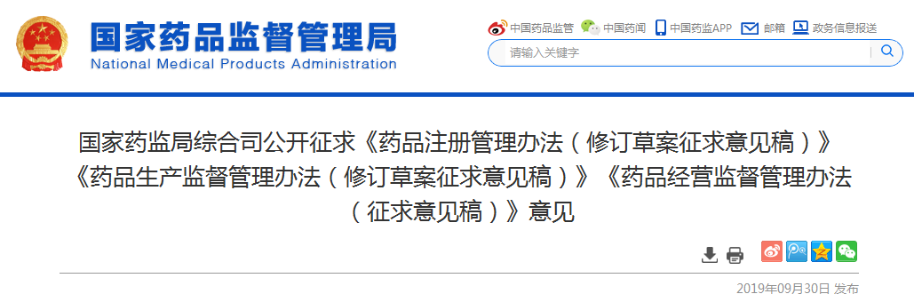國(guó)家藥監(jiān)局綜合司公開(kāi)征求《藥品注冊(cè)管理辦法(修訂草案征求意見(jiàn)稿)》《藥品生產(chǎn)監(jiān)督管理辦法(修訂草案征求意見(jiàn)稿)》《藥品經(jīng)營(yíng)監(jiān)督管理辦法(征求意見(jiàn)稿)》意見(jiàn)