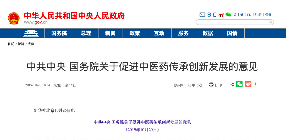 10月26日晚,國(guó)務(wù)院發(fā)布了《中共中央國(guó)務(wù)院關(guān)于促進(jìn)中醫(yī)藥傳承創(chuàng)新發(fā)展的意見(jiàn)》(以下簡(jiǎn)稱(chēng)《意見(jiàn)》)。