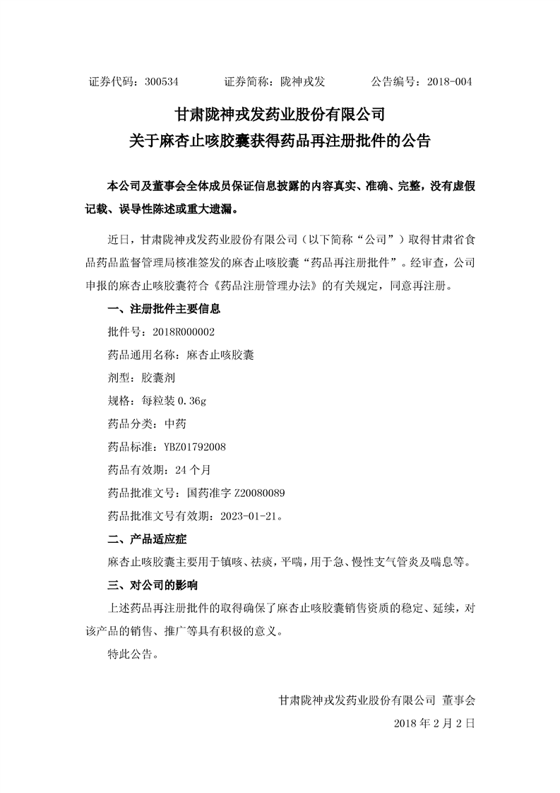 關(guān)于麻杏止咳膠囊獲得藥品再注冊(cè)批件的公告