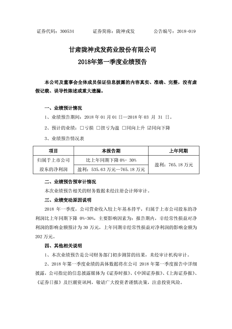 2018年第一季度業(yè)績預(yù)告