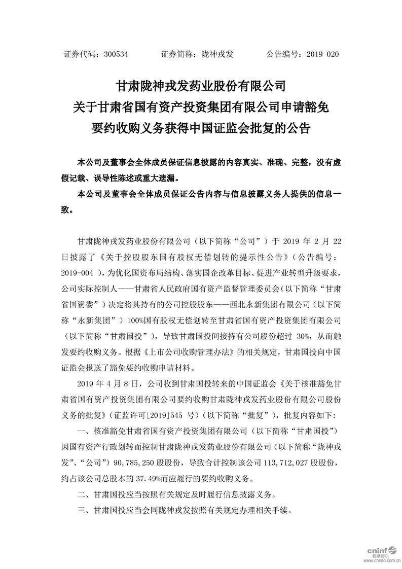 關(guān)于甘肅省國有資產(chǎn)投資集團有限公司申請豁免要約收購義務獲得中國證監(jiān)會批復的公告