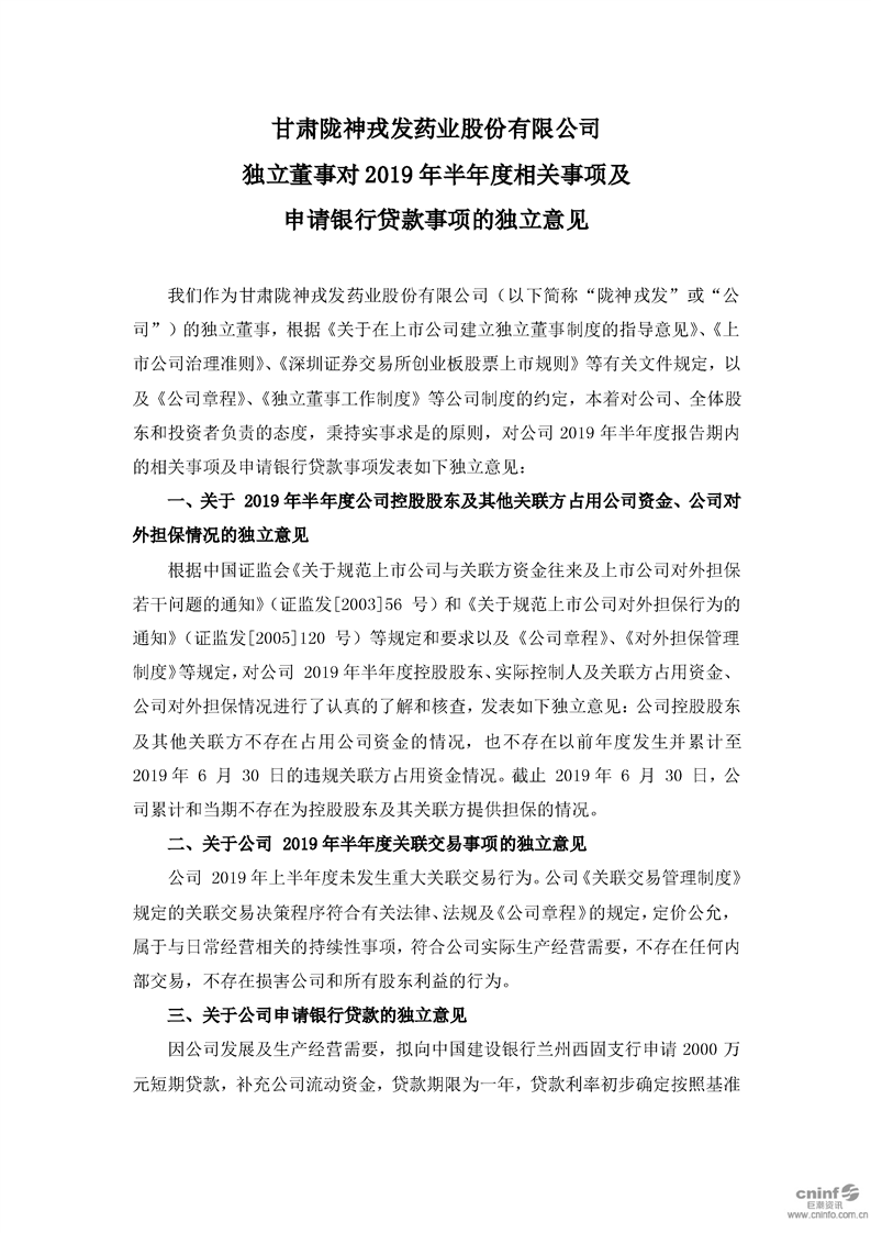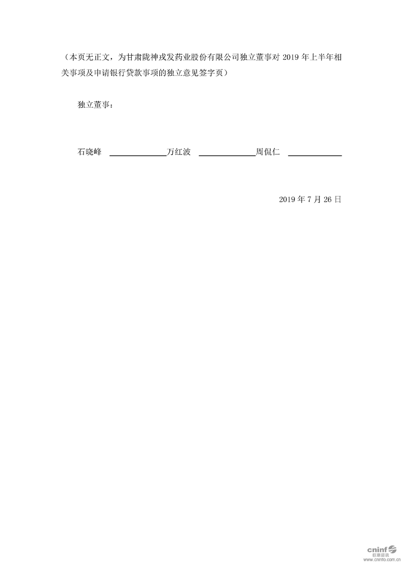 獨(dú)立董事對2019年半年度相關(guān)事項(xiàng)及申請銀行貸款事項(xiàng)的獨(dú)立意見