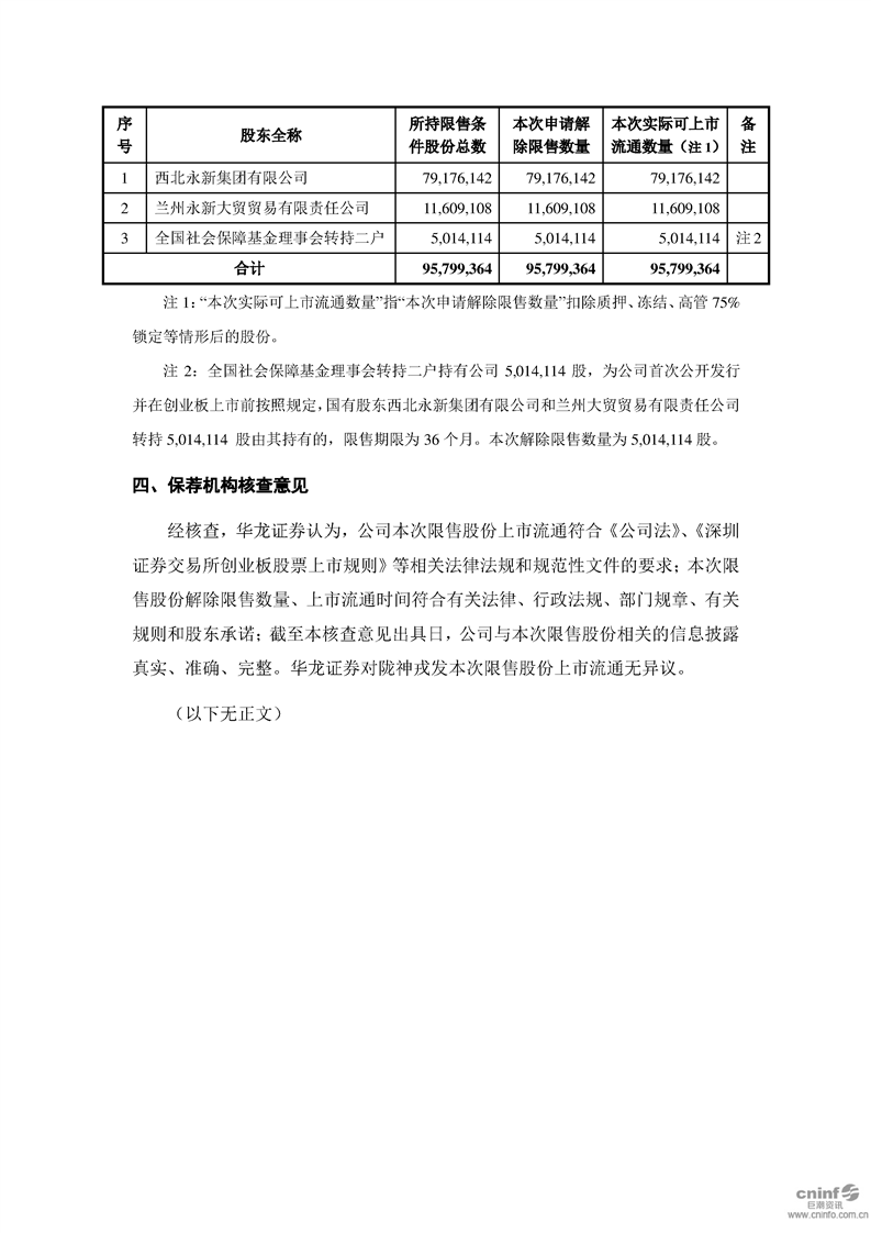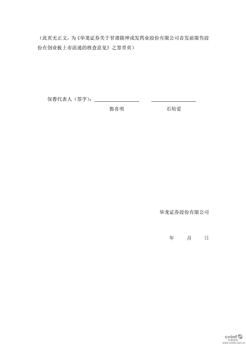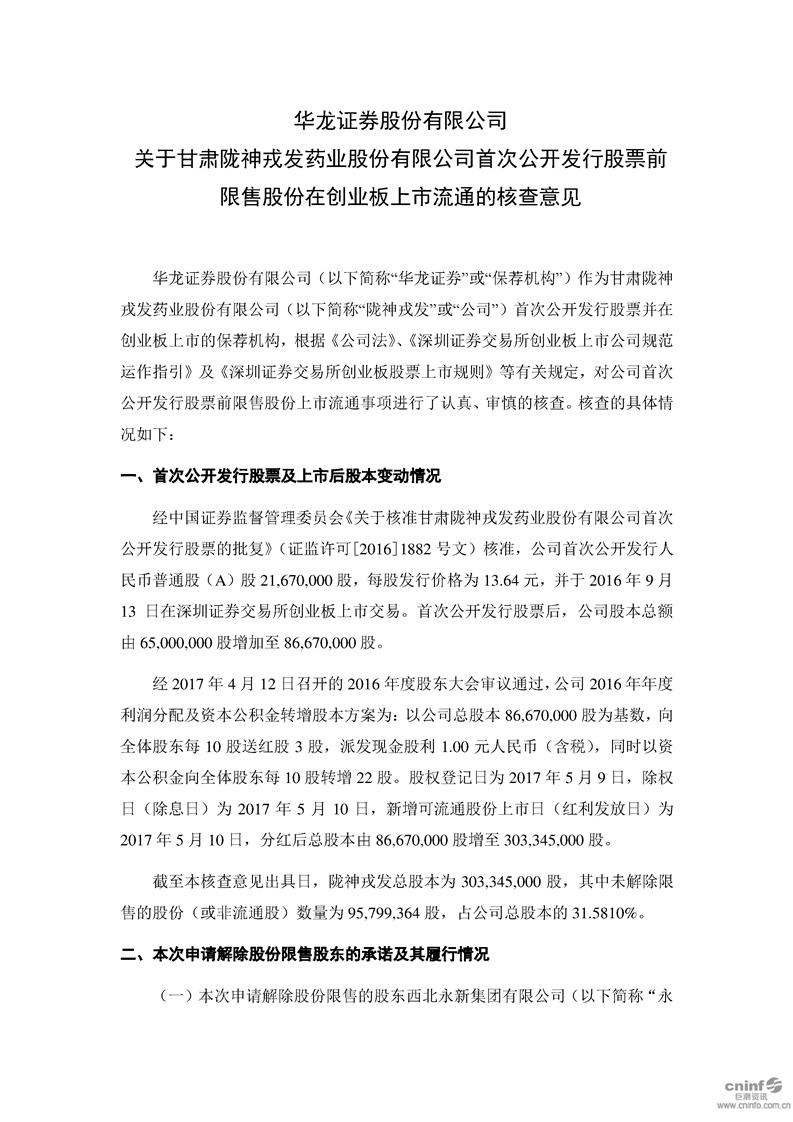 華龍證券股份有限公司關(guān)于公司首次公開發(fā)行股票前限售股份在創(chuàng)業(yè)板上市流通的核查意見(jiàn)