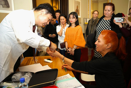 ↑2019年11月,世界針灸學會聯(lián)合會組織的“一帶一路”中醫(yī)藥針灸風采行來到捷克,通過學術研討、展覽、科普講座、健康咨詢等各種方式與來自捷克醫(yī)學界的同仁探討中醫(yī)發(fā)展,向捷克民眾傳播中醫(yī)知識。圖為中醫(yī)專家在為患者診療。達娜·科什奈洛娃 攝