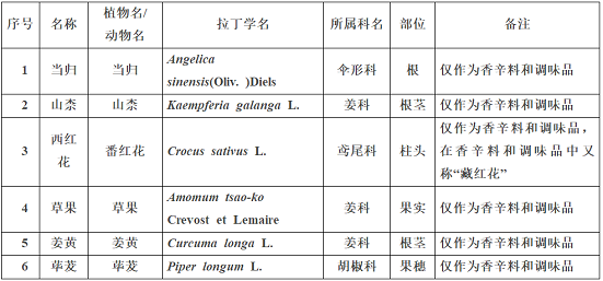 山柰、西紅花、草果、姜黃、蓽茇。在《中國(guó)藥典》(2015年版)收載。我國(guó)傳統(tǒng)將山柰、西紅花、草果、姜黃、蓽茇作為香辛料和調(diào)味品食用,且列入《香辛料和調(diào)味品 名稱(chēng)》(GB/T 12729.1-2008)。在食藥物質(zhì)目錄中所列的基源植物和食用部分與《中國(guó)藥典》記載一致。