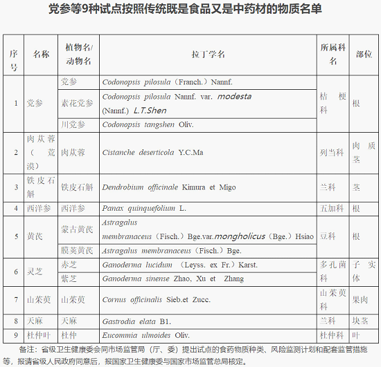關(guān)于對(duì)黨參等9種物質(zhì)開(kāi)展按照傳統(tǒng)既是食品又是中藥材的物質(zhì)管理試點(diǎn)工作的通知