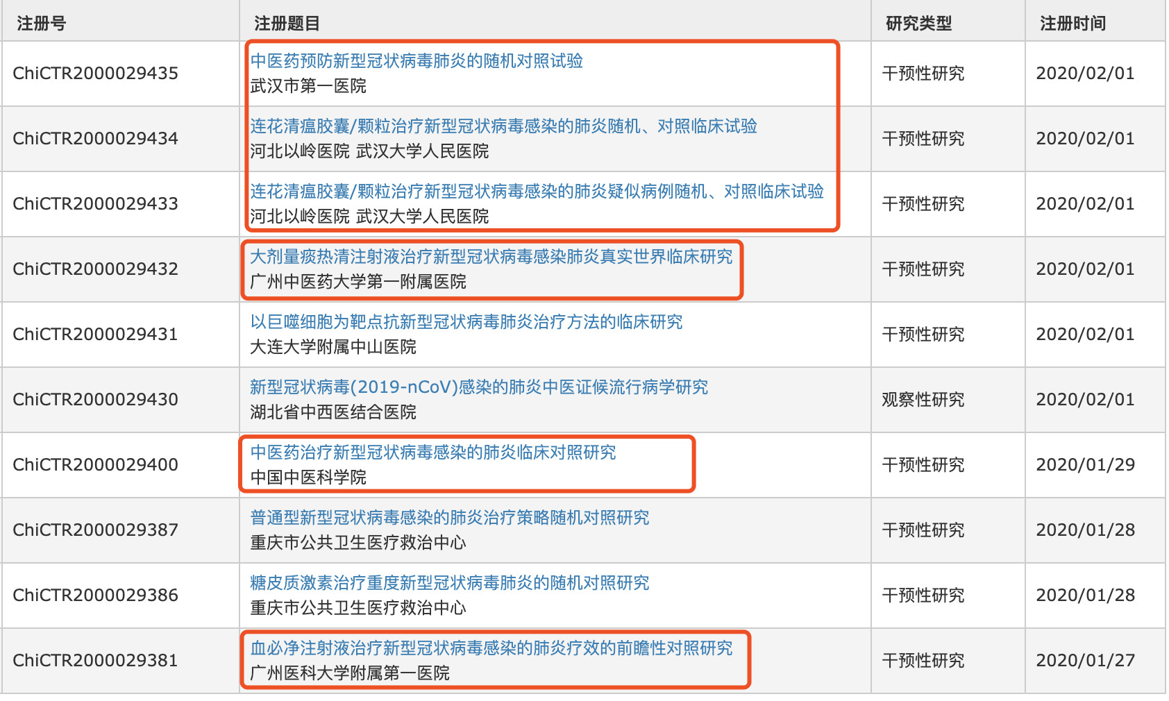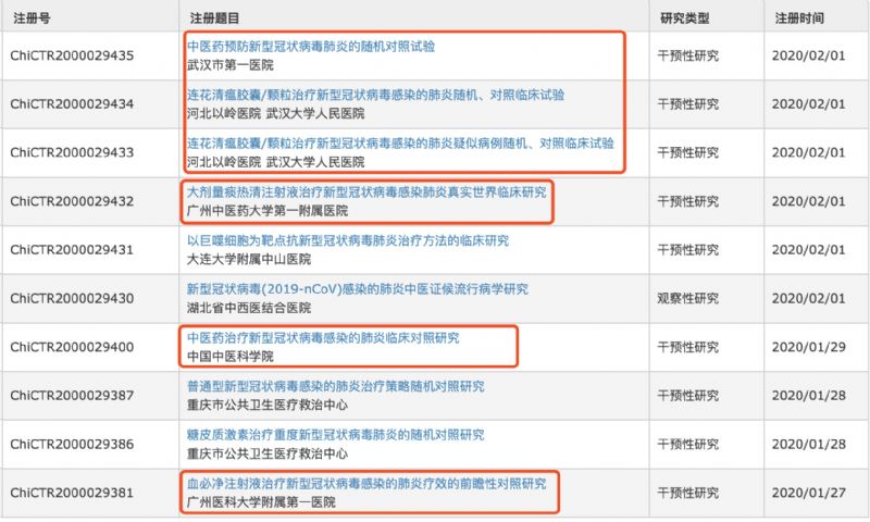 通過(guò)查詢中國(guó)臨床試驗(yàn)注冊(cè)中心,涉及新型冠狀病毒肺炎的臨床研究有40項(xiàng),其中涉及到中醫(yī)藥的項(xiàng)目有:中西藥結(jié)合治療、中醫(yī)藥防治、肺康復(fù)、蓮花清瘟膠囊/顆粒、痰熱清注射液、血必凈注射、熱毒寧注射液等18項(xiàng),占總數(shù)的45%。