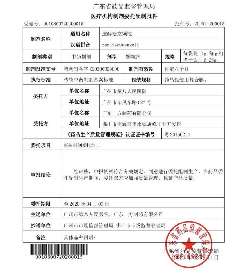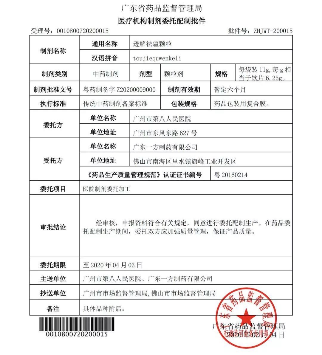 1月31日,廣東省藥監(jiān)局?jǐn)M將廣州市第八人民醫(yī)院擬申報(bào)的醫(yī)療機(jī)構(gòu)制劑肺炎一號(hào)方納入應(yīng)急審批,待申請(qǐng)人整理提交申報(bào)材料后,將即時(shí)審批。