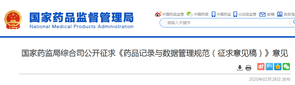 國家藥監(jiān)局綜合司公開征求《藥品記錄與數(shù)據(jù)管理規(guī)范(征求意見稿)》意見