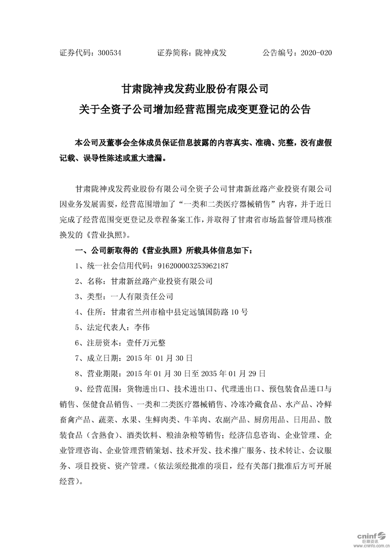 關(guān)于全資子公司增加經(jīng)營(yíng)范圍完成變更登記的公告