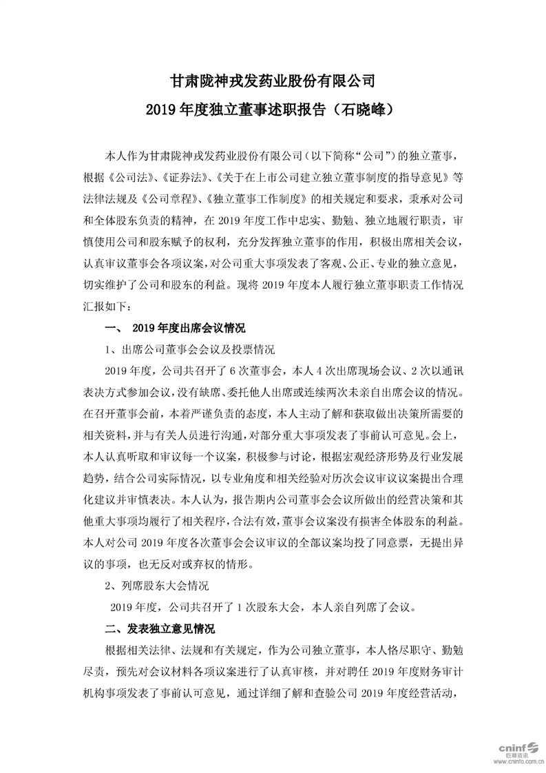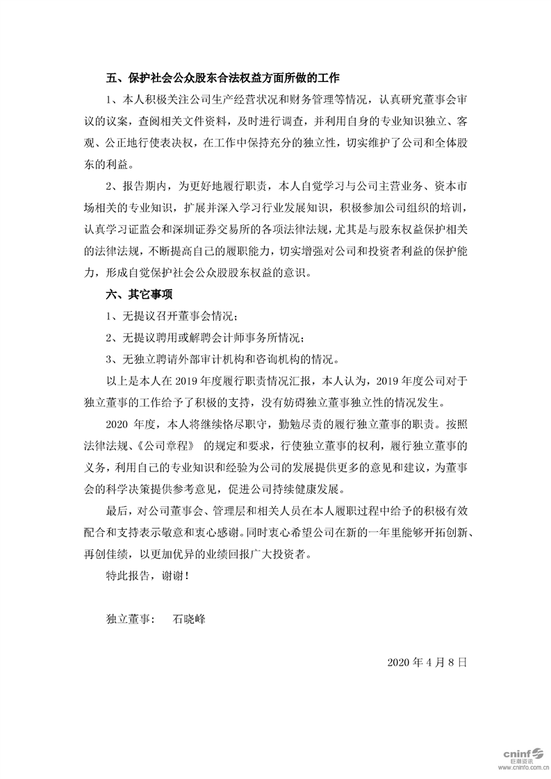 2019年度獨(dú)立董事述職報(bào)告(石曉峰)
