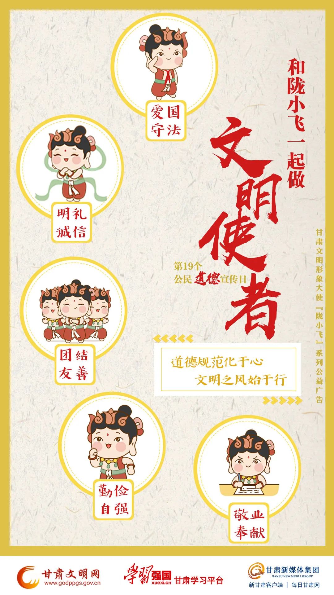 今年是中共中央頒發(fā)《公民道德建設(shè)實(shí)施綱要》20周年,為大力倡導(dǎo)“愛國守法、明禮誠信、團(tuán)結(jié)友善、勤儉自強(qiáng)、敬業(yè)奉獻(xiàn)”20字基本道德規(guī)范,省文明辦特推出“和隴小飛一起做文明使者”公益海報(bào)。