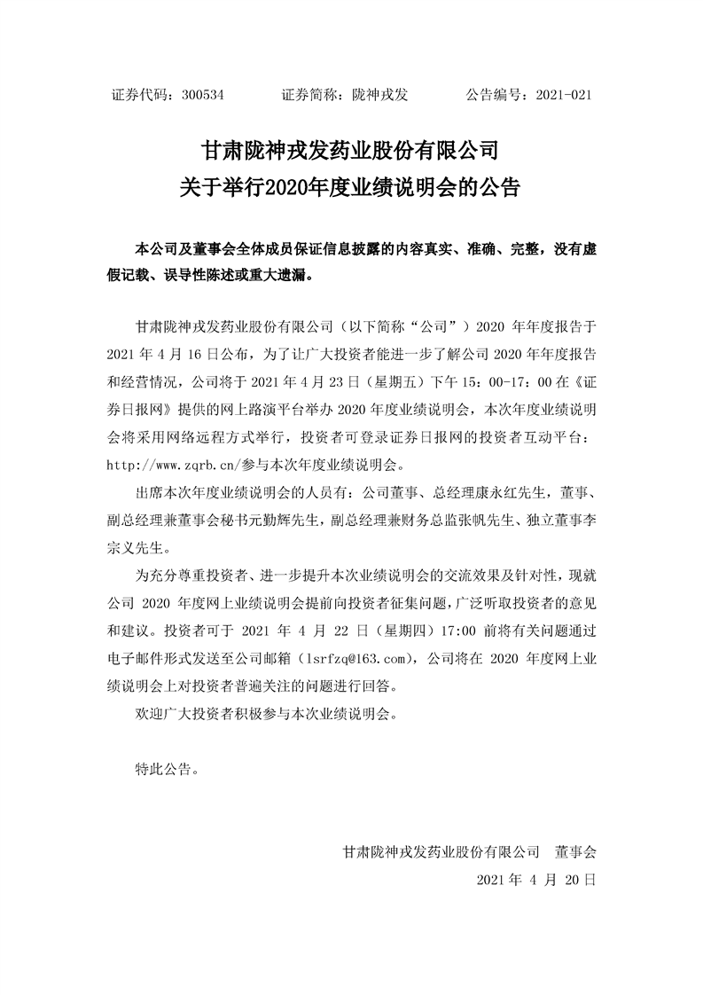 關(guān)于舉行2020年度業(yè)績說明會(huì)的公告