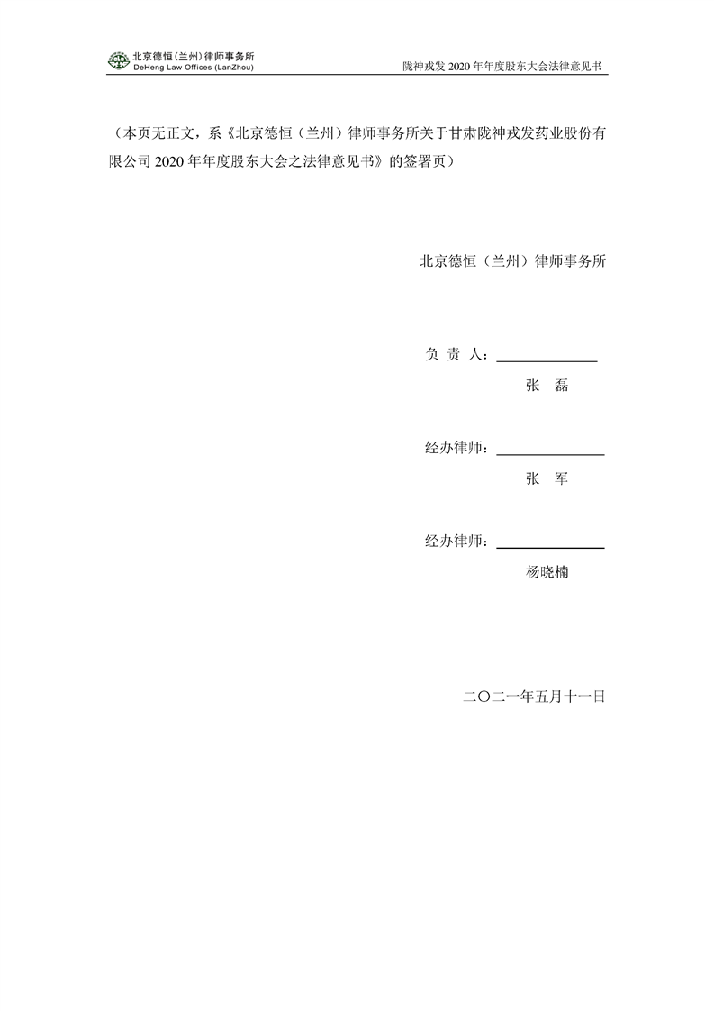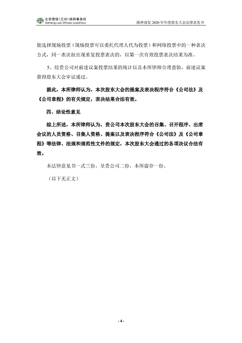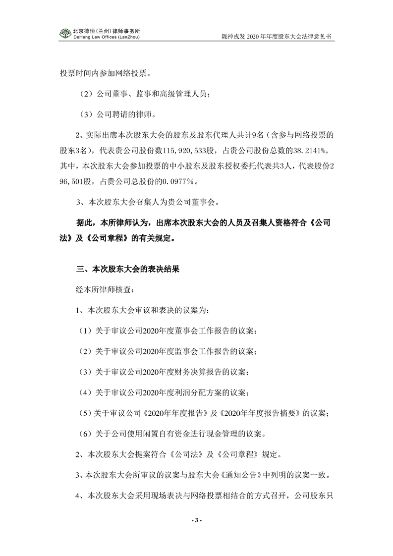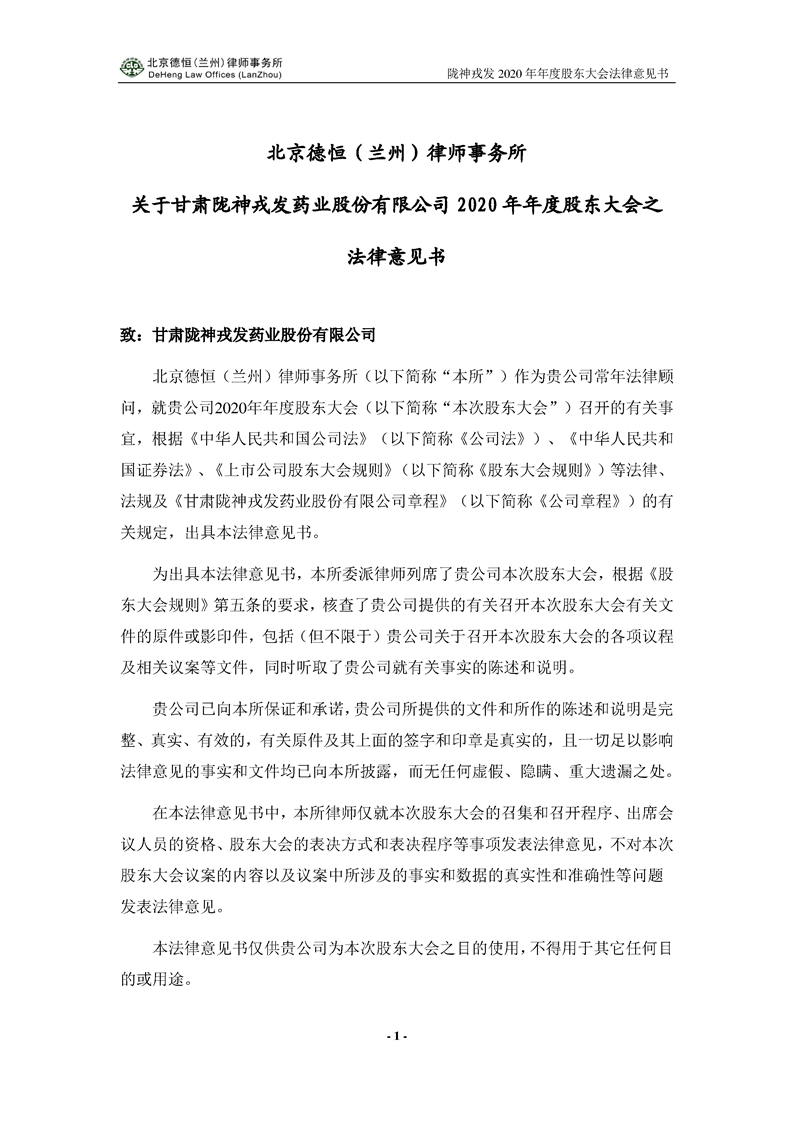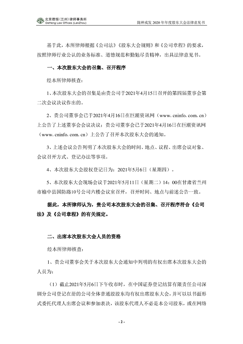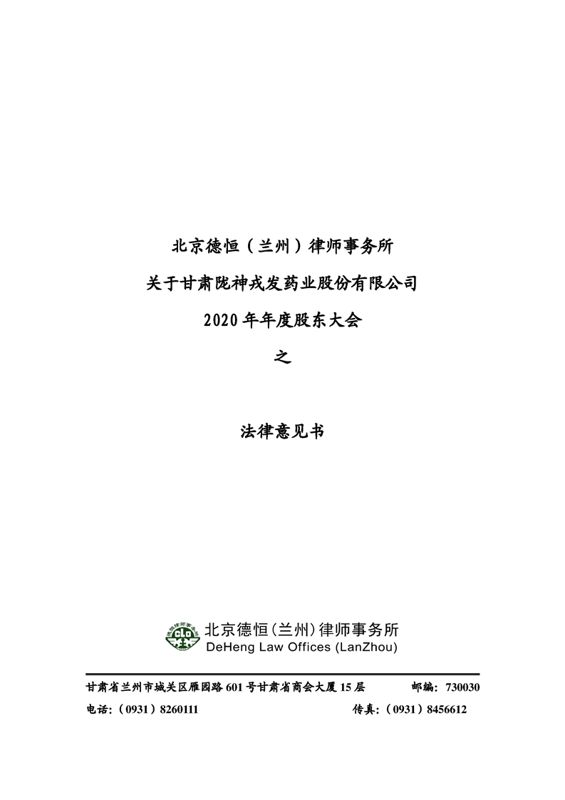 隴神戎發(fā)2020年年度股東大會法律意見書