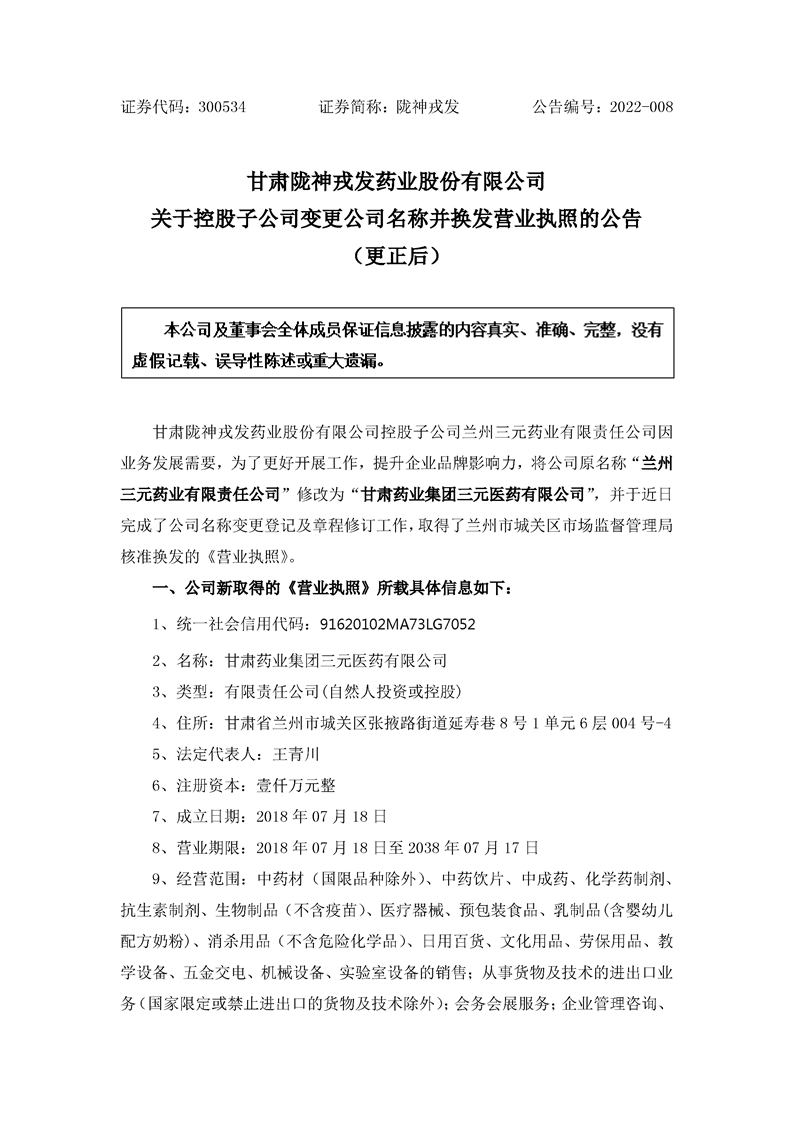 關于控股子公司變更公司名稱并換發(fā)營業(yè)執(zhí)照的公告(更正后)