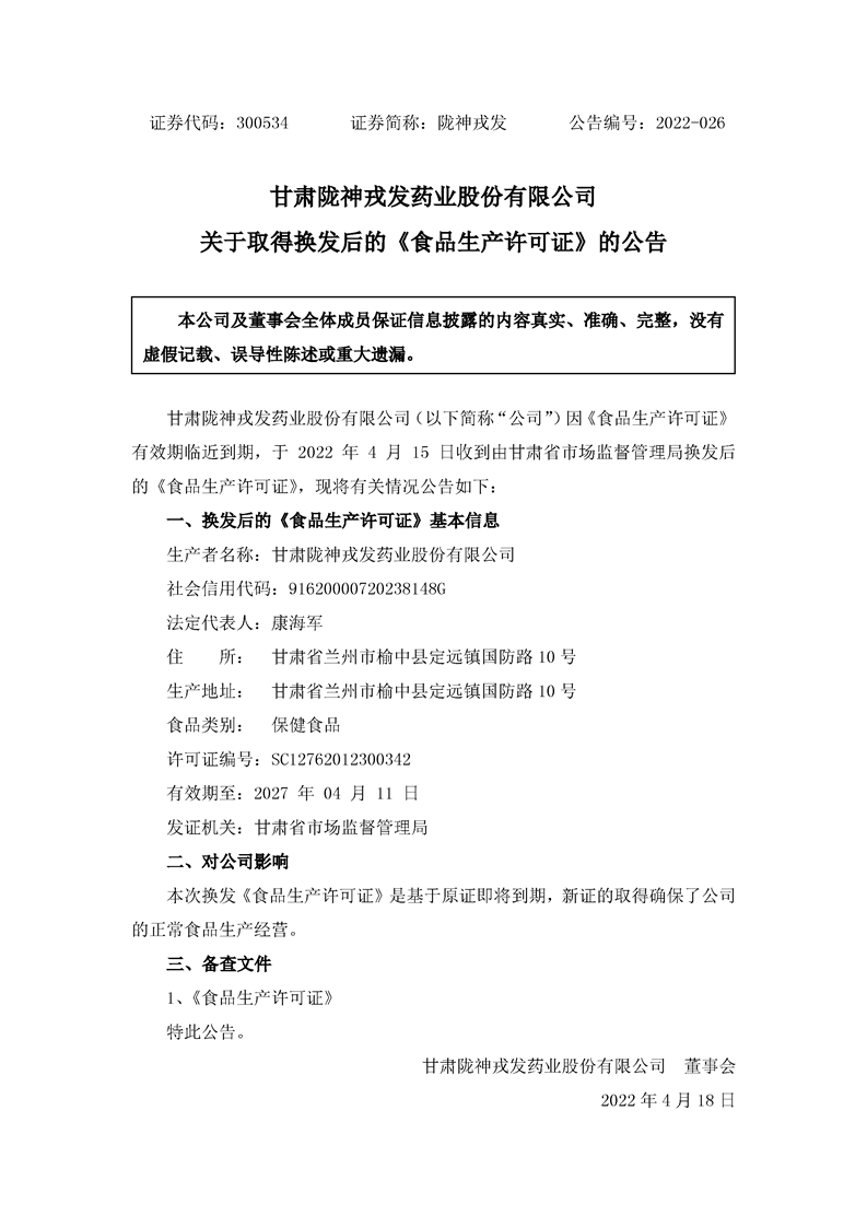 關(guān)于取得換發(fā)后的《食品生產(chǎn)許可證》的公告