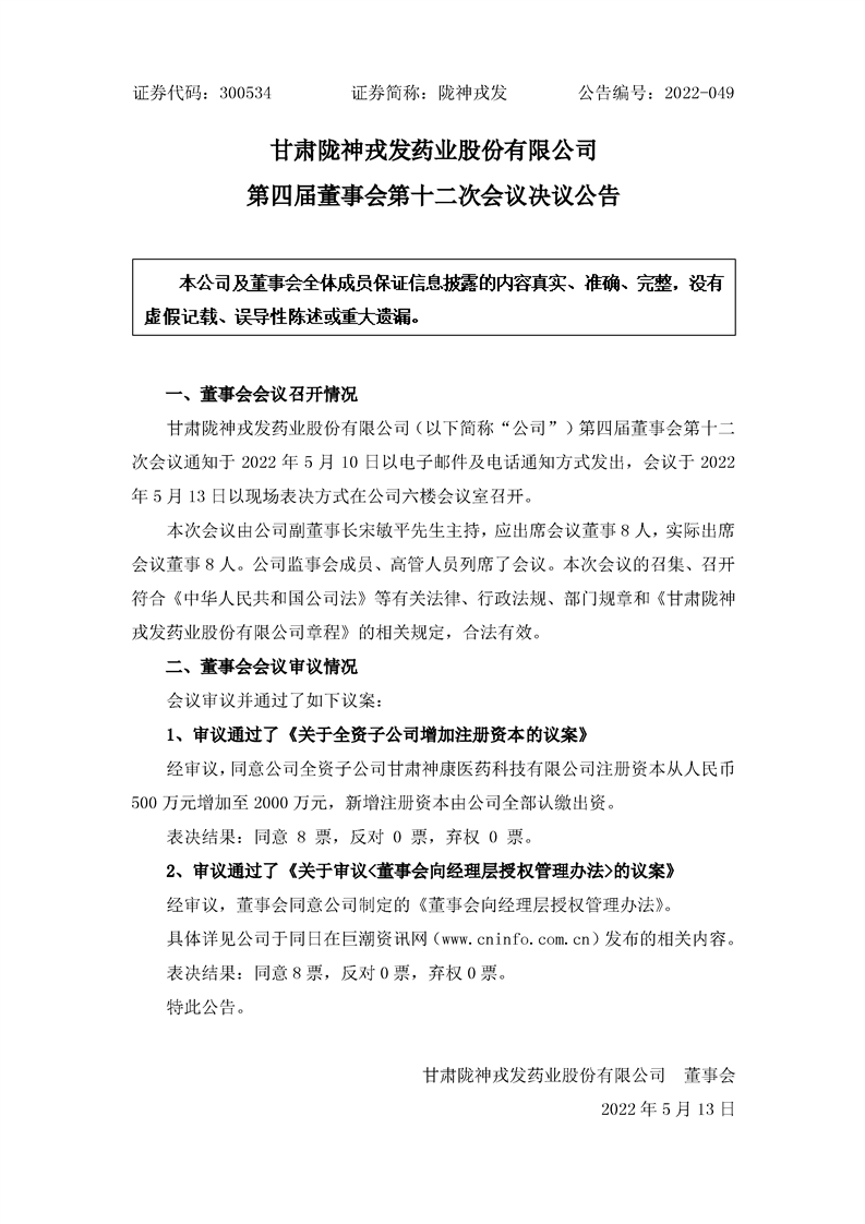 第四屆董事會第十二次會議決議公告