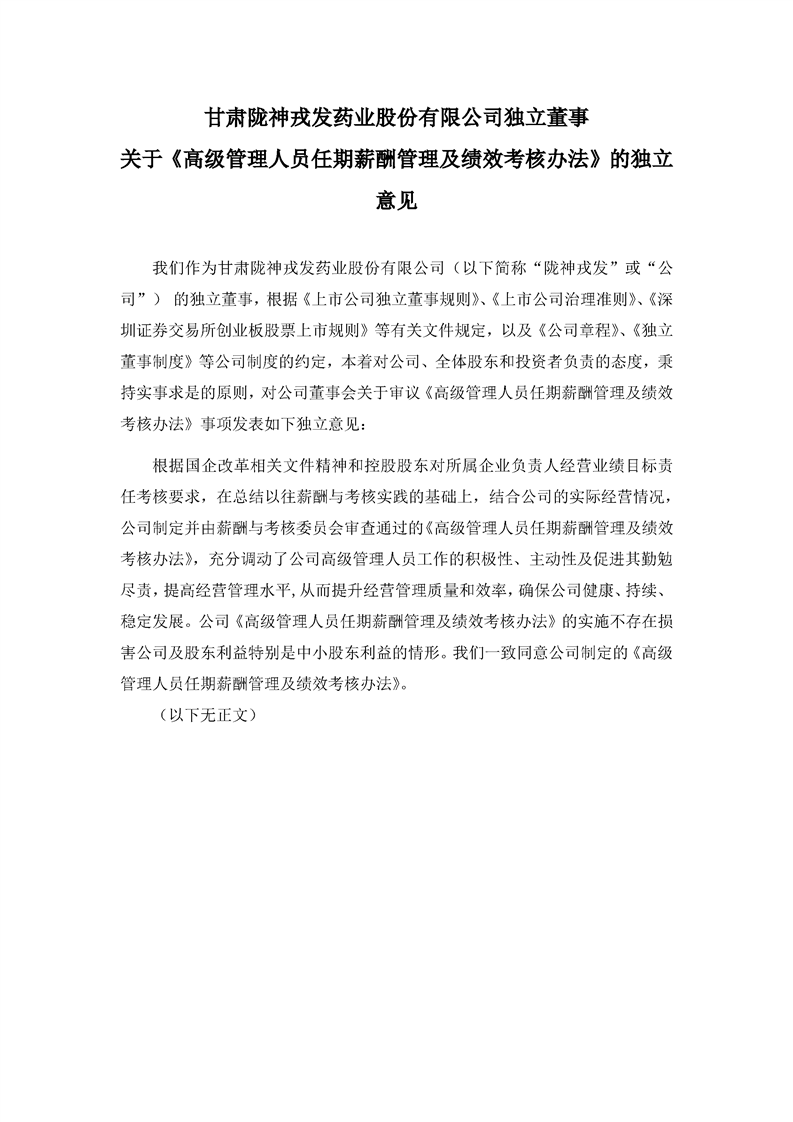 獨(dú)立董事關(guān)于《高級管理人員任期薪酬管理及績效考核辦法》的獨(dú)立意見