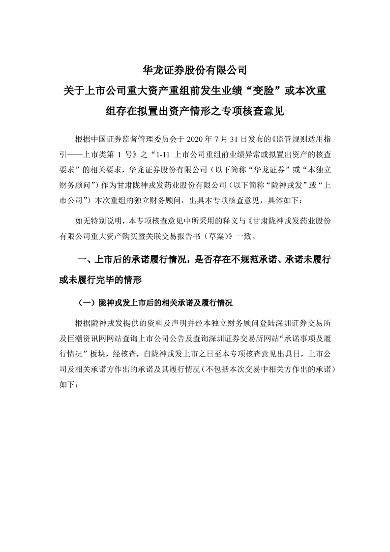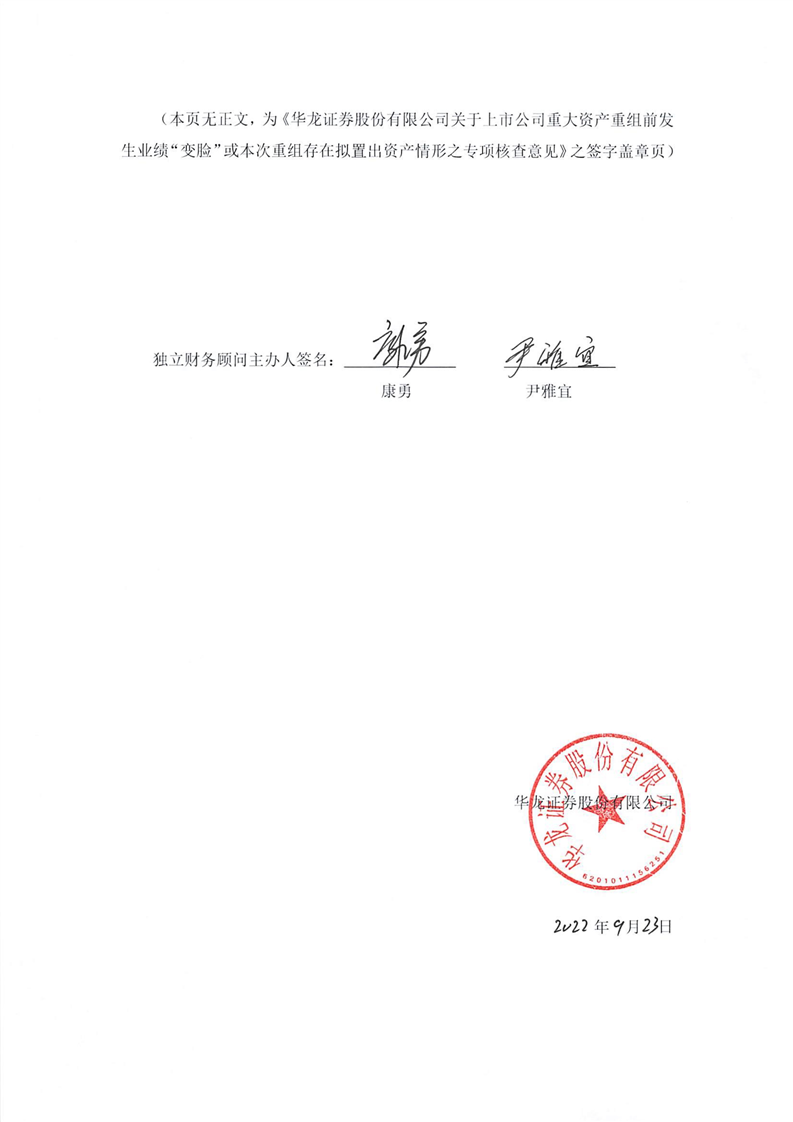 華龍證券股份有限公司關(guān)于上市公司重大資產(chǎn)重組前發(fā)生業(yè)績變臉或本次重組存在擬置出資產(chǎn)情形之專項(xiàng)核查意見