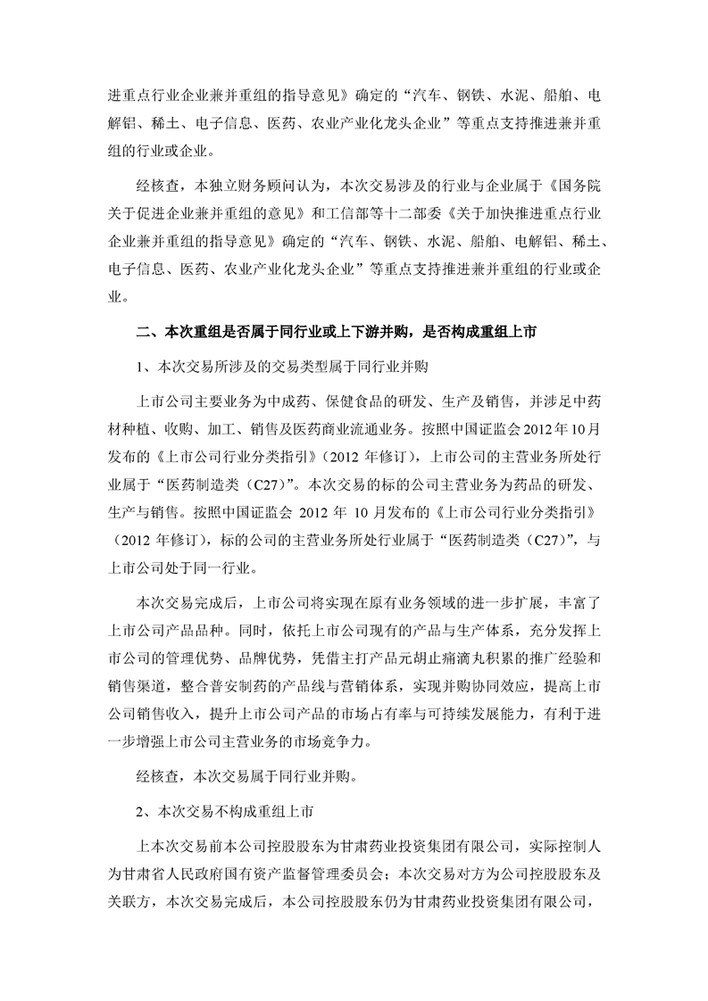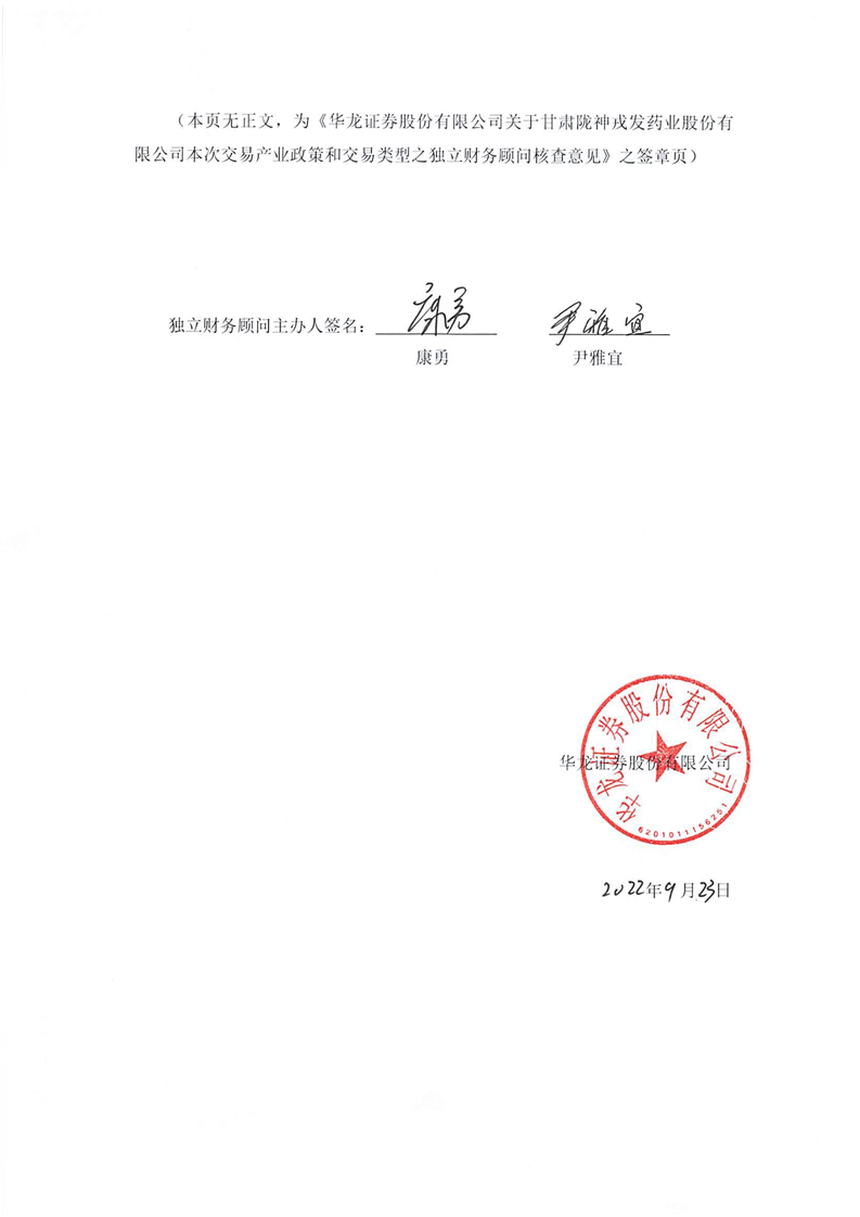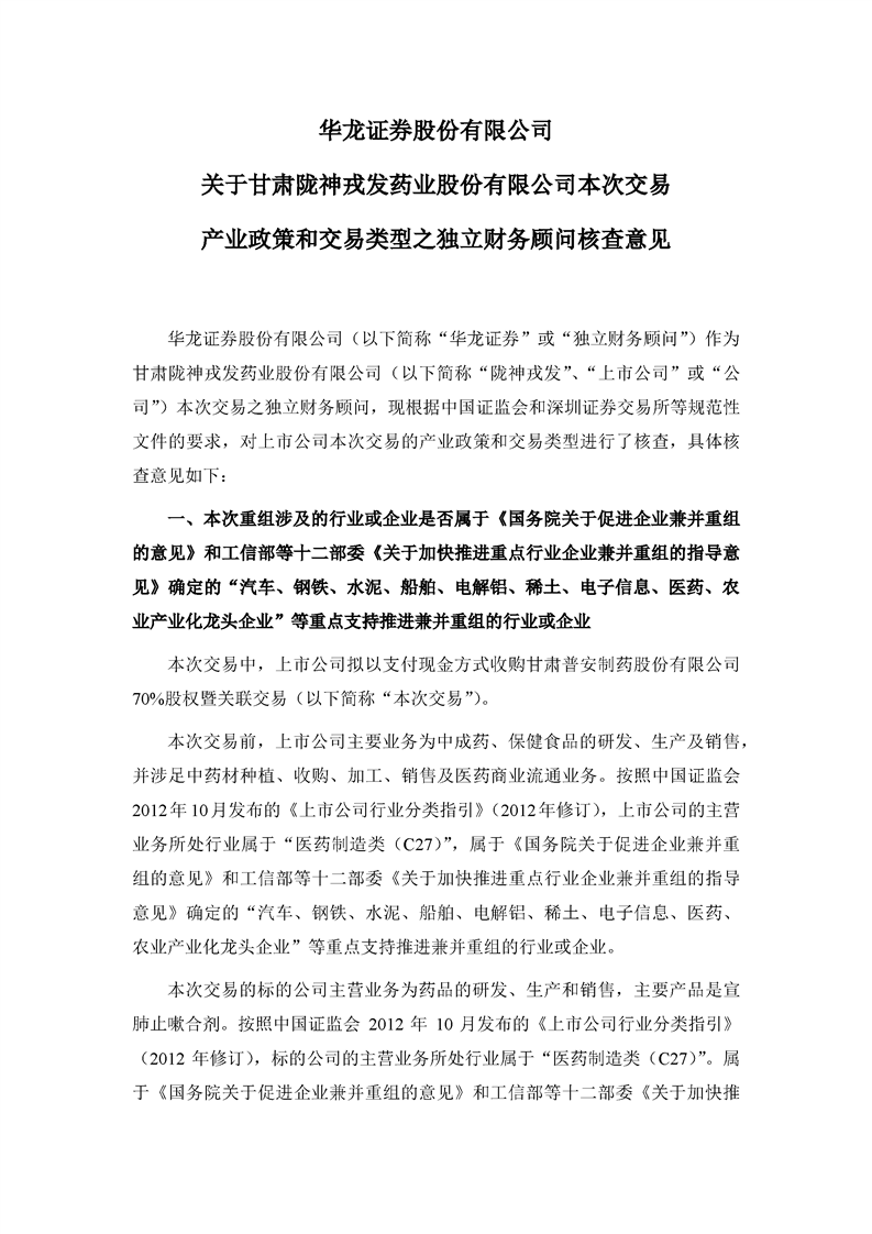 華龍證券股份有限公司關(guān)于甘肅隴神戎發(fā)藥業(yè)股份有限公司本次交易產(chǎn)業(yè)政策和交易類型之獨(dú)立財(cái)務(wù)顧問核查意見
