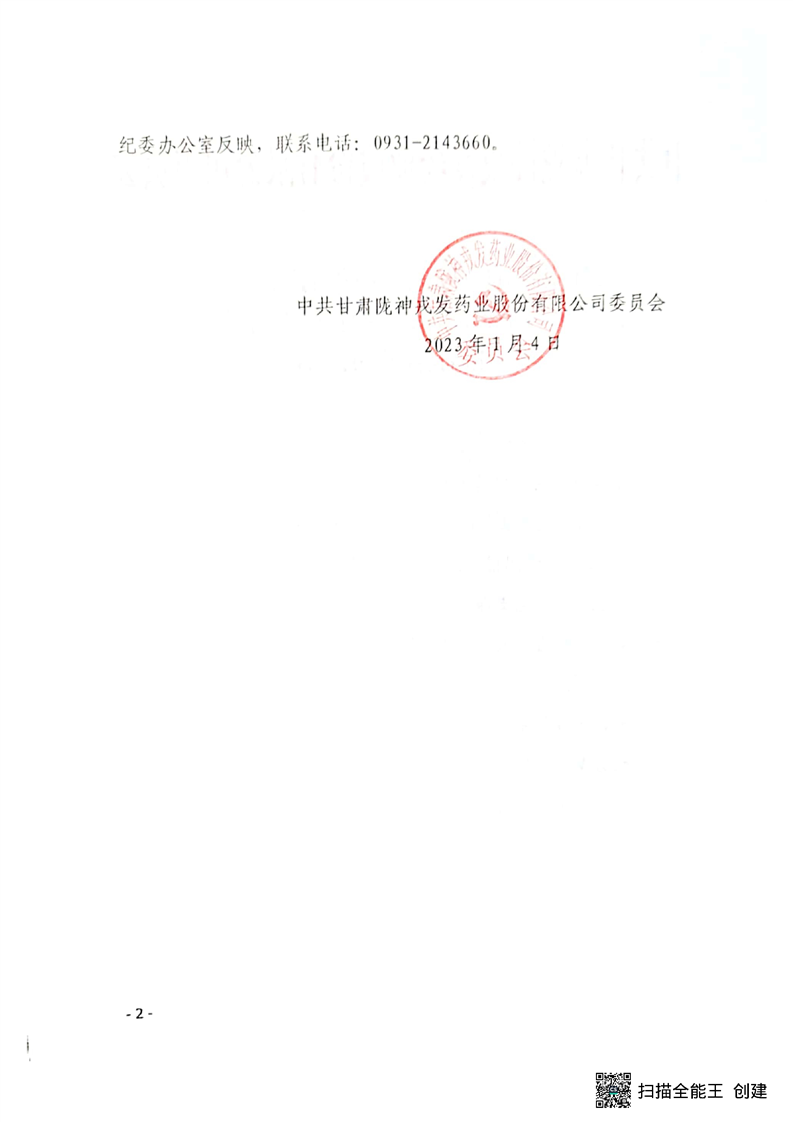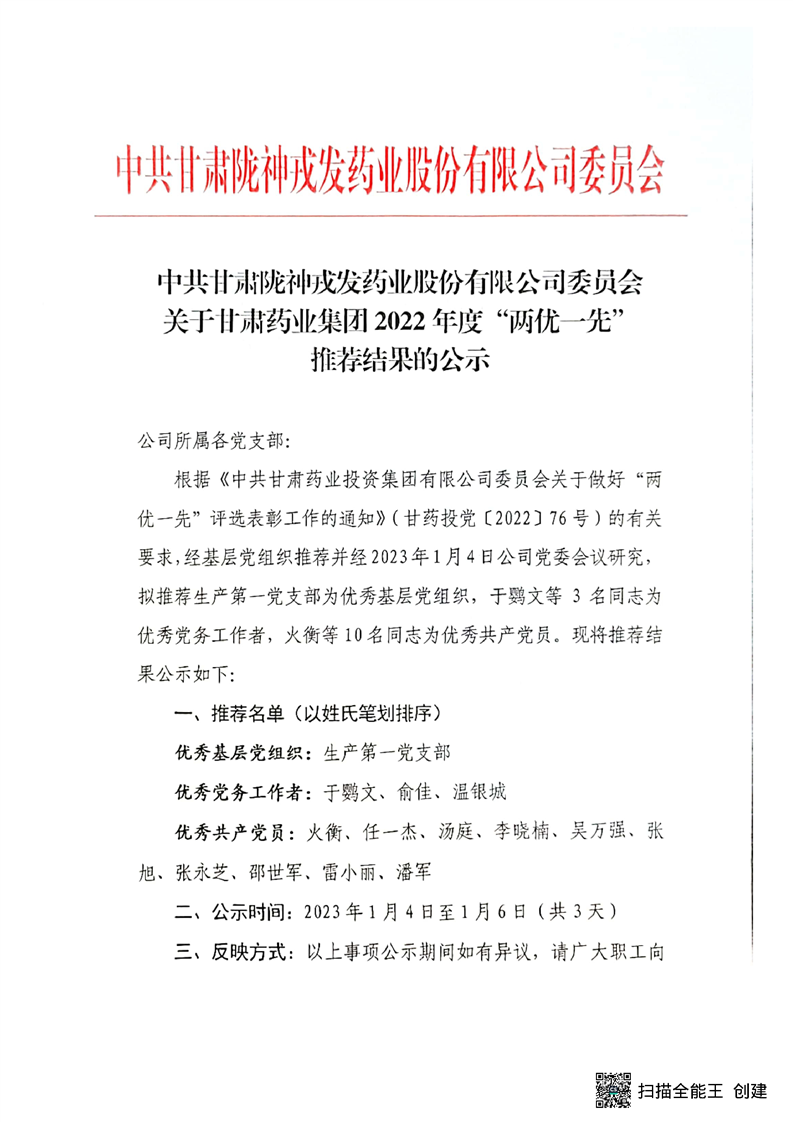 關(guān)于甘肅藥業(yè)集團2022年度“兩優(yōu)一先”推薦結(jié)果的公示