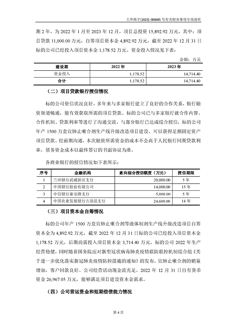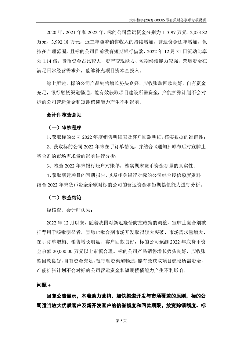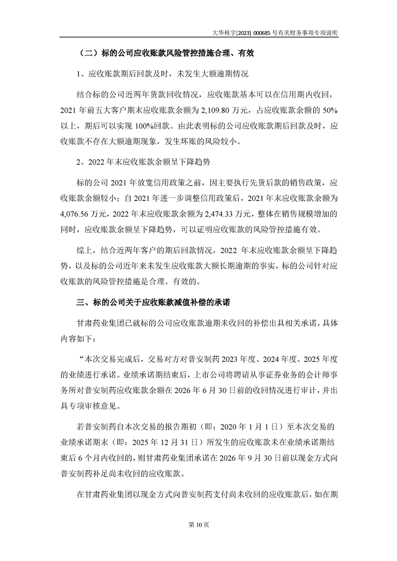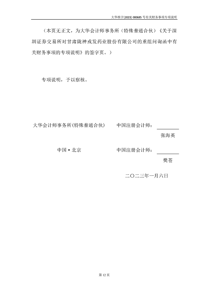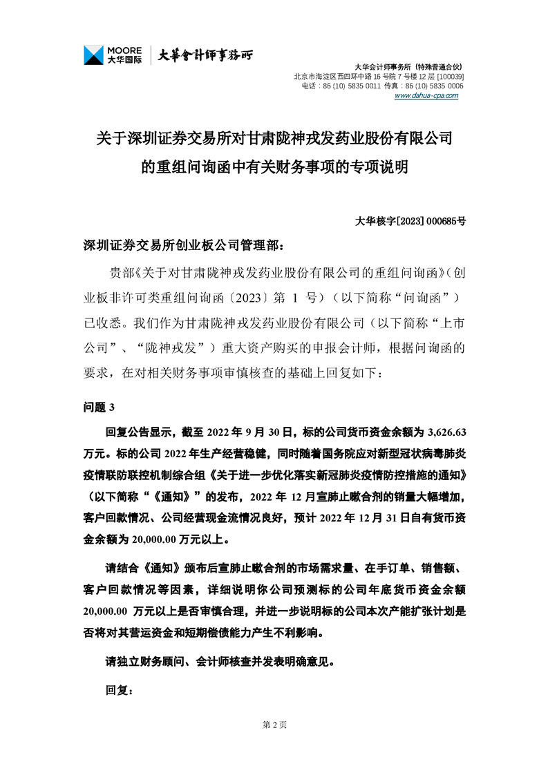 大華會計師事務所關于深圳證券交易所對甘肅隴神戎發(fā)藥業(yè)股份有限公司的重組問詢函中有關財務事項的專項說明-大華核字[2023]000685號