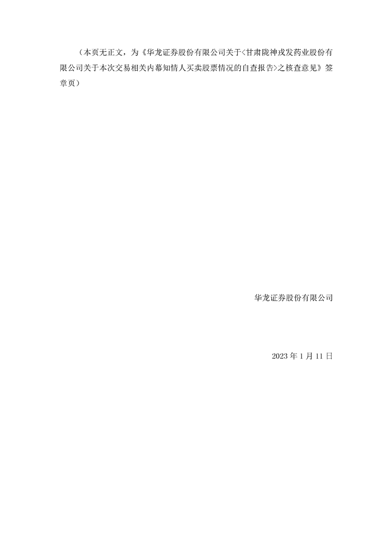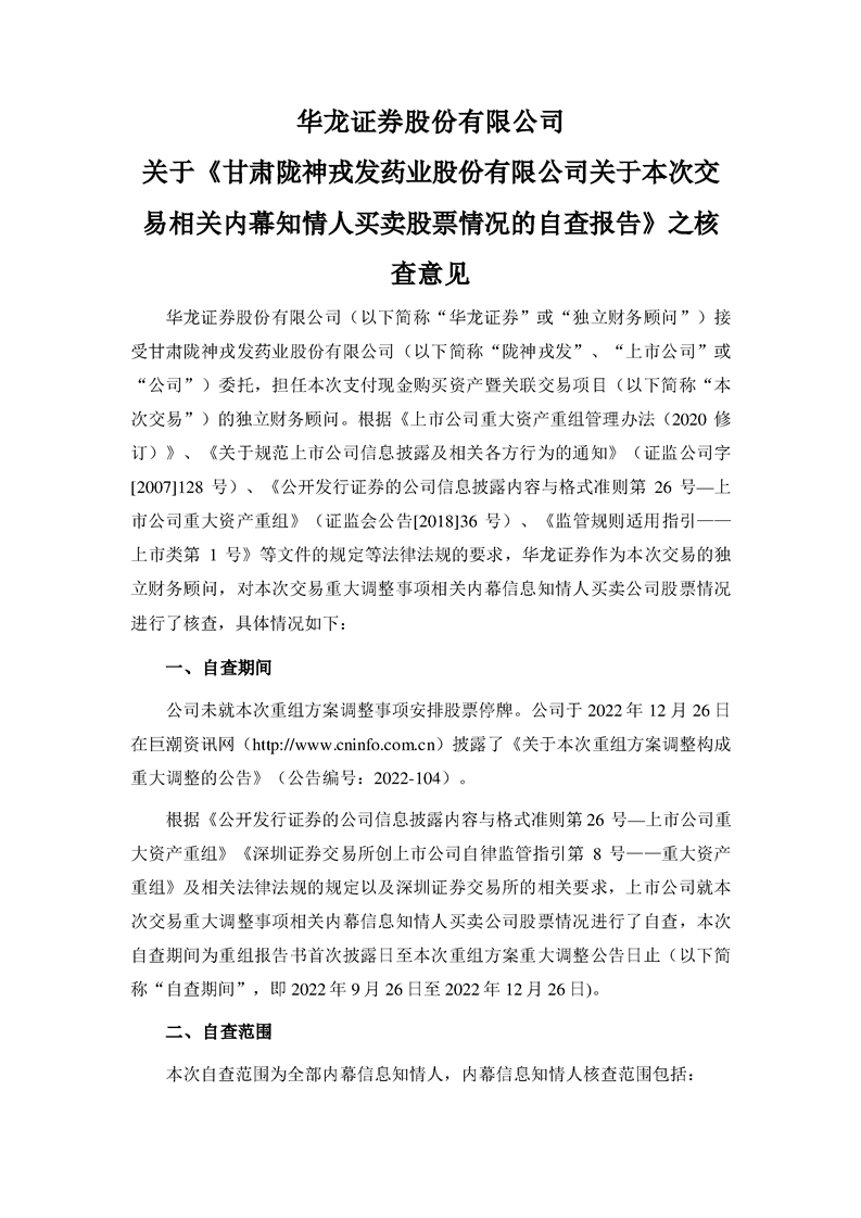 華龍證券股份有限公司關于《甘肅隴神戎發(fā)藥業(yè)股份有限公司關于本次交易相關內(nèi)幕知情人買賣股票情況的自查報告》之核查意見