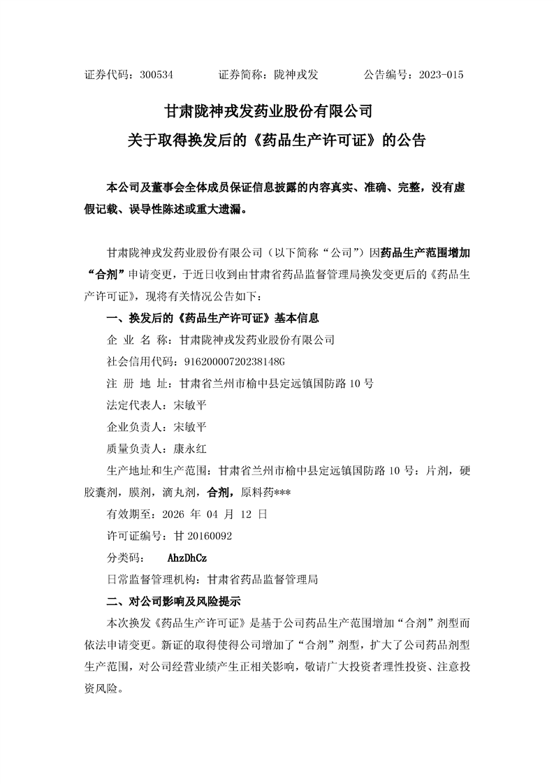 關于取得換發(fā)后的《藥品生產許可證》的公告