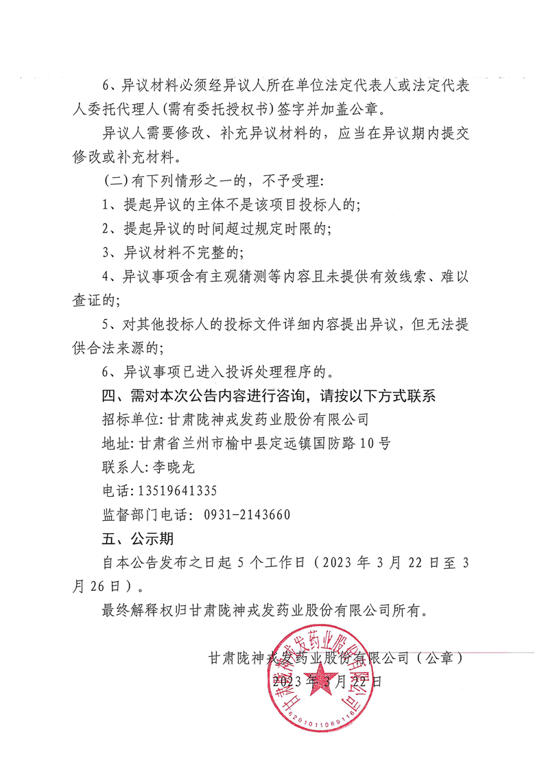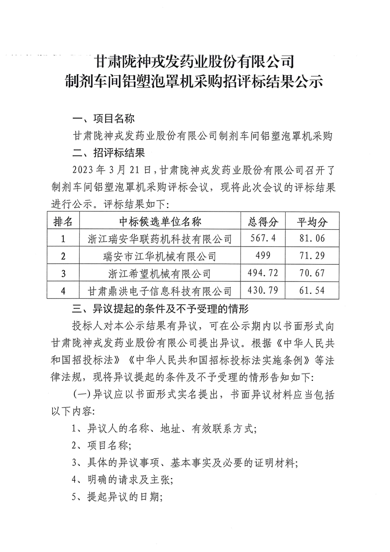 甘肅隴神戎發(fā)藥業(yè)股份有限公司制劑車間鋁塑泡罩機(jī)采購招評(píng)標(biāo)結(jié)果公示