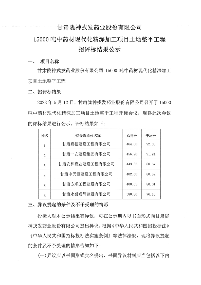 甘肅隴神戎發(fā)藥業(yè)股份有限公司15000噸中藥材現(xiàn)代化精深加工項(xiàng)目土地整平工程招評(píng)標(biāo)結(jié)果公示