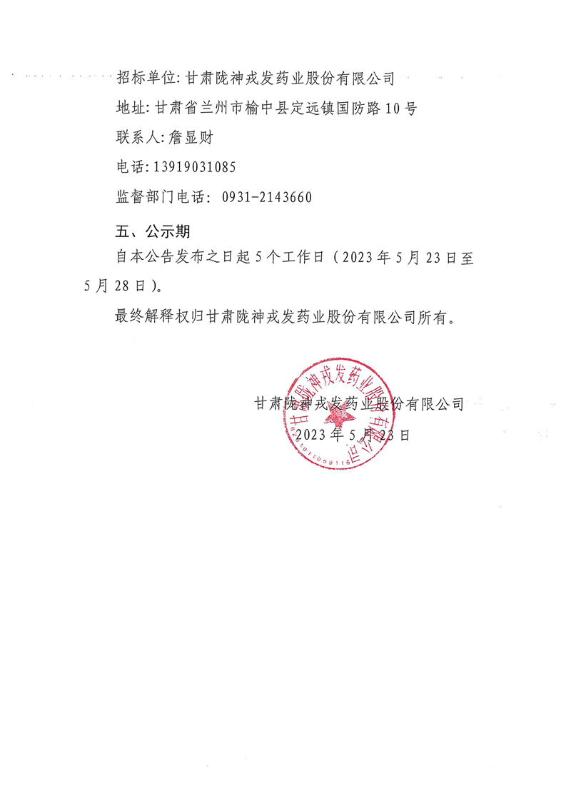 甘肅隴神戎發(fā)藥業(yè)股份有限公司購買職工通勤車競(jìng)爭(zhēng)性談判公告評(píng)標(biāo)結(jié)果公示