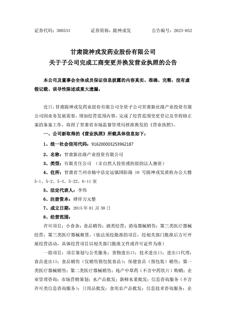 關(guān)于子公司完成工商變更并換發(fā)營(yíng)業(yè)執(zhí)照的公告