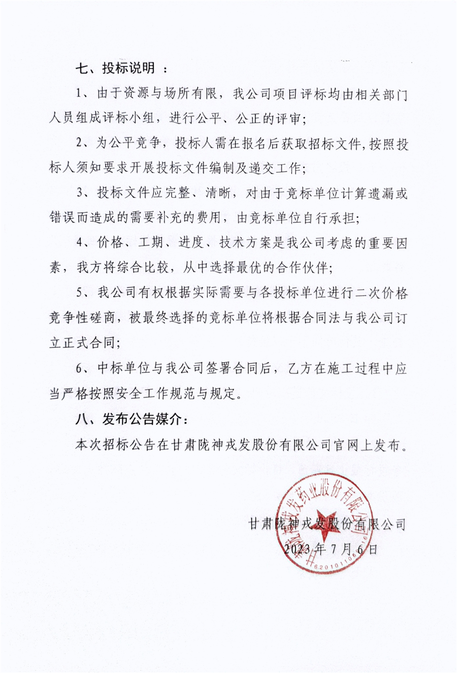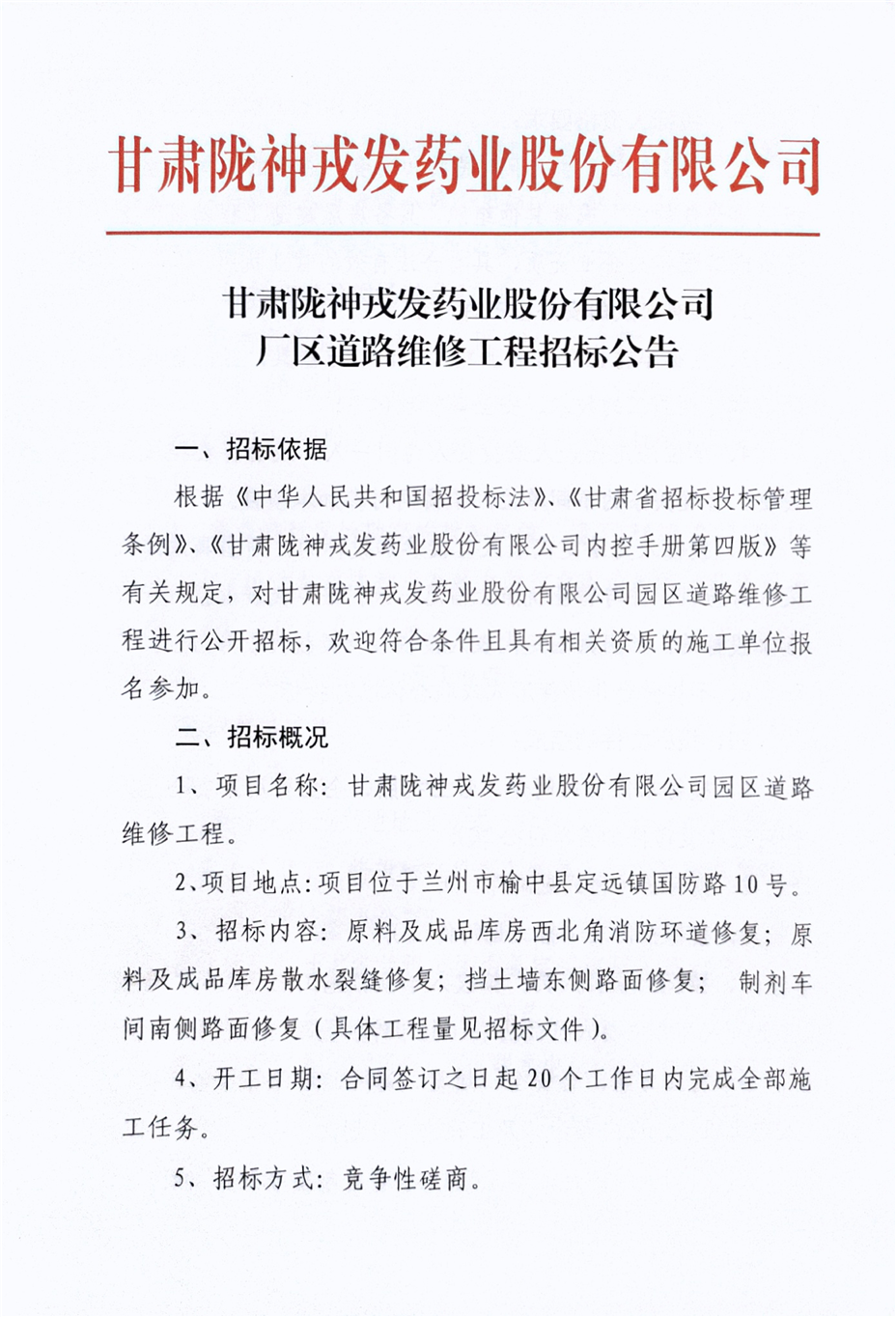 甘肅隴神戎發(fā)藥業(yè)股份有限公司廠區(qū)道路維修工程招標(biāo)公告