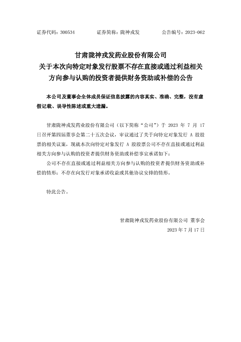 關于本次向特定對象發(fā)行股票不存在直接或通過利益相關方向參與認購的投資者提供財務資助或補償?shù)墓?/h2>