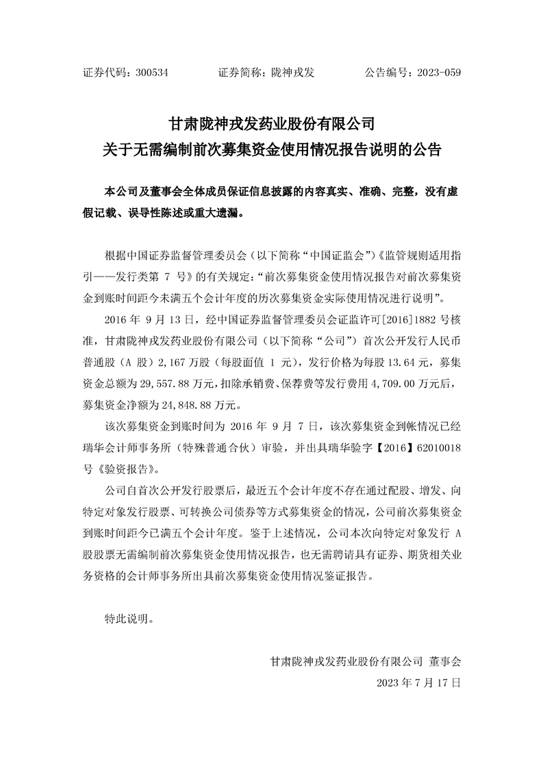 關(guān)于無需編制前次募集資金使用情況報(bào)告說明的公告