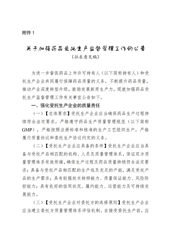附件:1.關(guān)于加強(qiáng)藥品受托生產(chǎn)監(jiān)督管理工作的公告(征求意見稿)