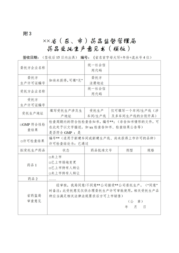 請(qǐng)于2024年12月10日前,將有關(guān)意見按照《意見反饋表》格式要求反饋至電子郵箱yaopinjianguan-2@nmpa.gov.cn,郵件標(biāo)題請(qǐng)注明“受托生產(chǎn)監(jiān)管公告意見反饋”。