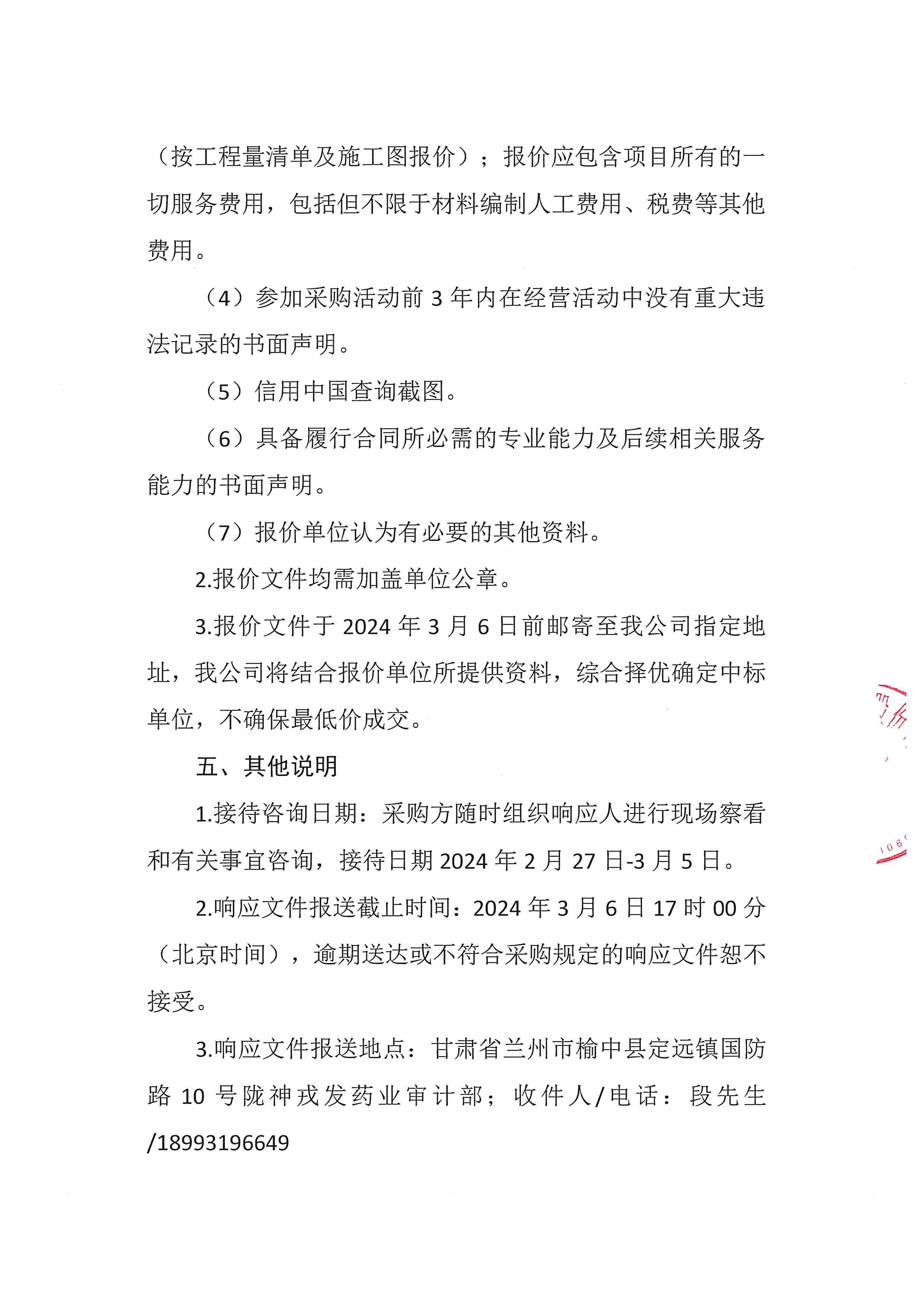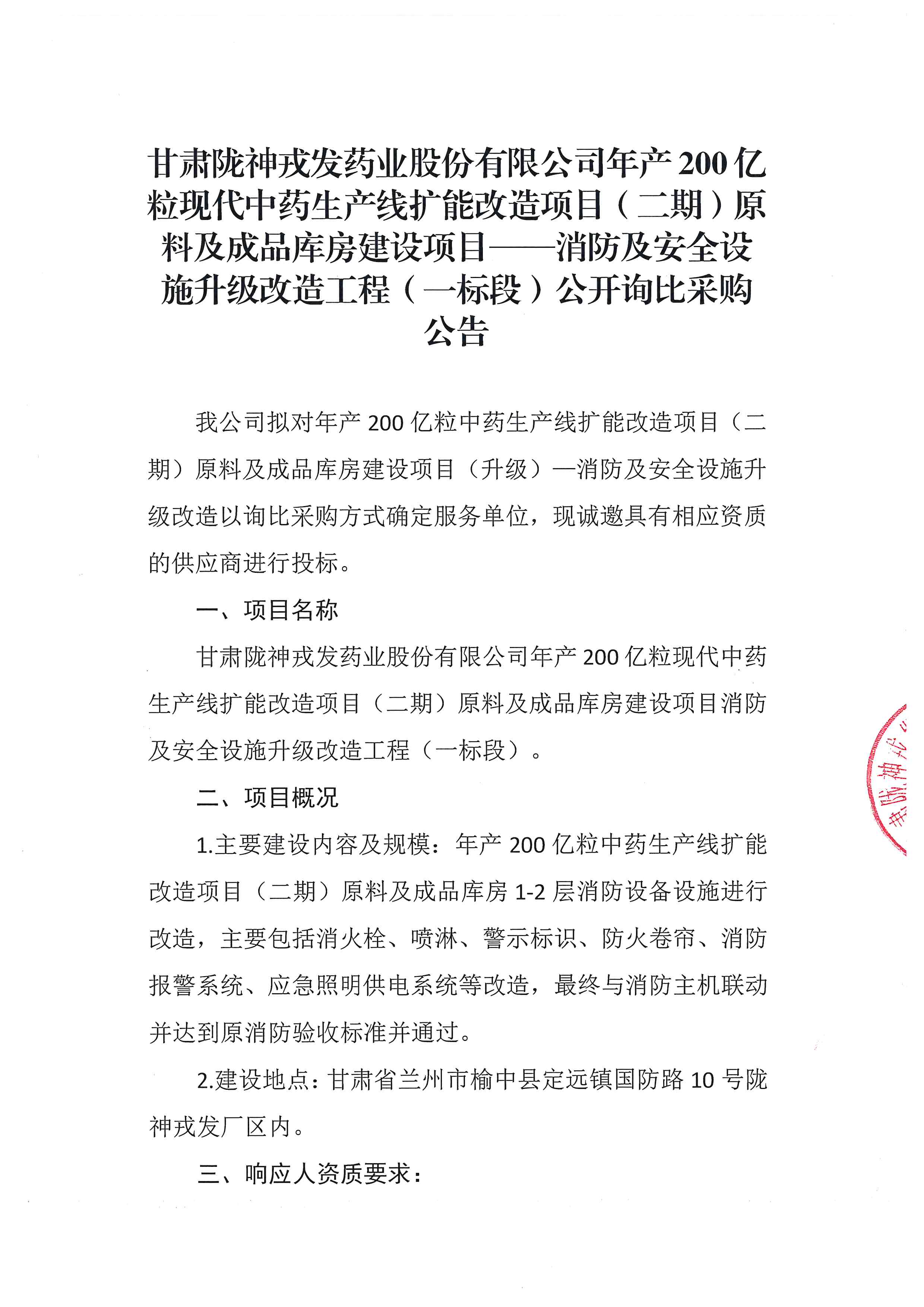 甘肅隴神戎發(fā)藥業(yè)股份有限公司年產(chǎn)200億粒現(xiàn)代中藥生產(chǎn)線擴(kuò)能改造項目(二期)原料及成品庫房建設(shè)項目——消防及安全設(shè)施升級改造工程(一標(biāo)段)公開詢比采購公告