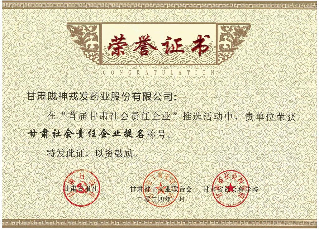隴神戎發(fā)黨委書記、董事長宋敏平榮獲“甘肅社會責任企業(yè)家”稱號;隴神戎發(fā)榮獲“甘肅社會責任企業(yè)提名”稱號