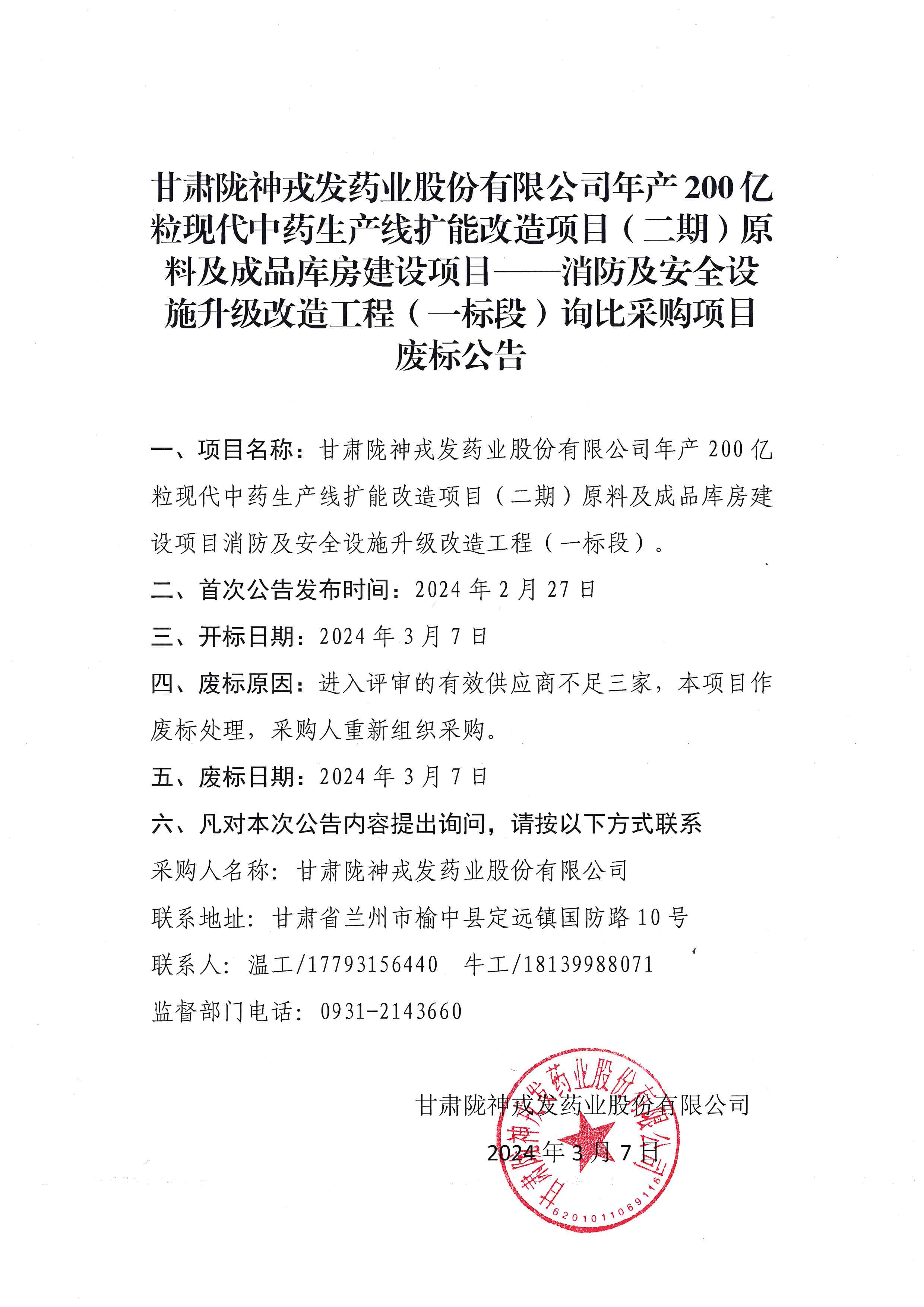 甘肅隴神戎發(fā)藥業(yè)股份有限公司年產(chǎn)200億粒現(xiàn)代中藥生產(chǎn)線擴(kuò)能改造項(xiàng)目(二期)原料及成品庫(kù)房建設(shè)項(xiàng)目--消防及安全設(shè)施升級(jí)改造工程(一標(biāo)段)詢比采購(gòu)項(xiàng)目廢標(biāo)公告