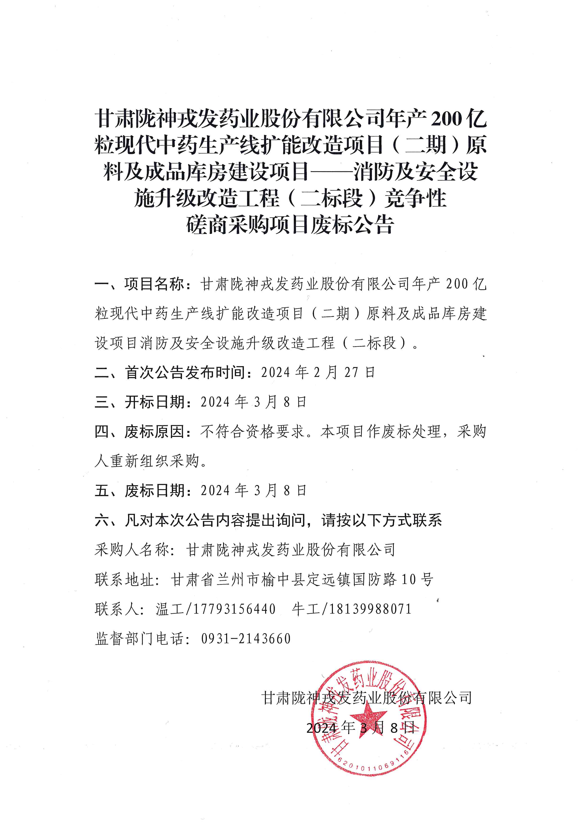 甘肅隴神戎發(fā)藥業(yè)股份有限公司年產(chǎn)200億粒現(xiàn)代中藥生產(chǎn)線擴能改造項目(二期)原料及成品庫房建設(shè)項目--消防及安全設(shè)施升級改造工程(二標段)競爭性磋商采購項目廢標公告