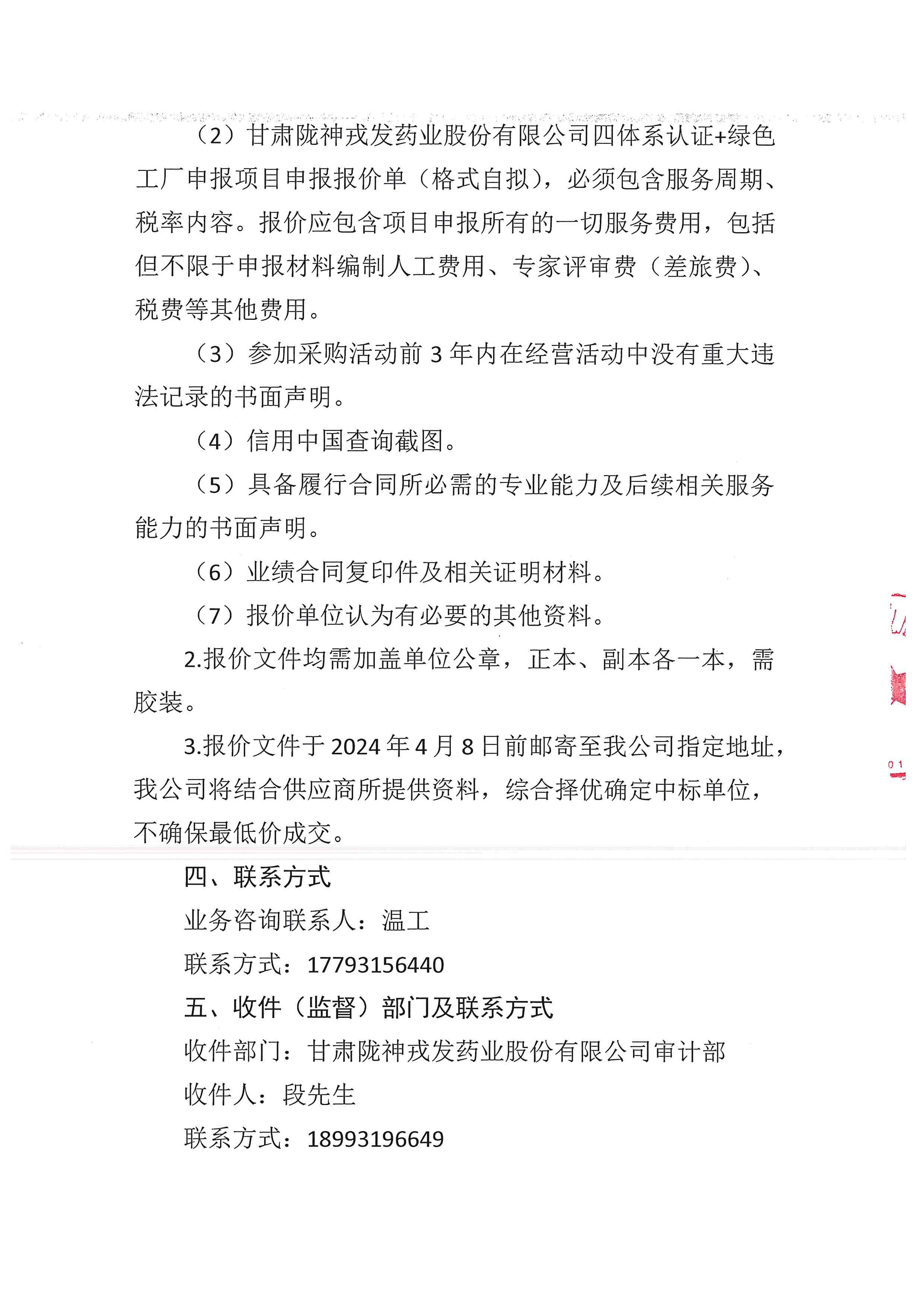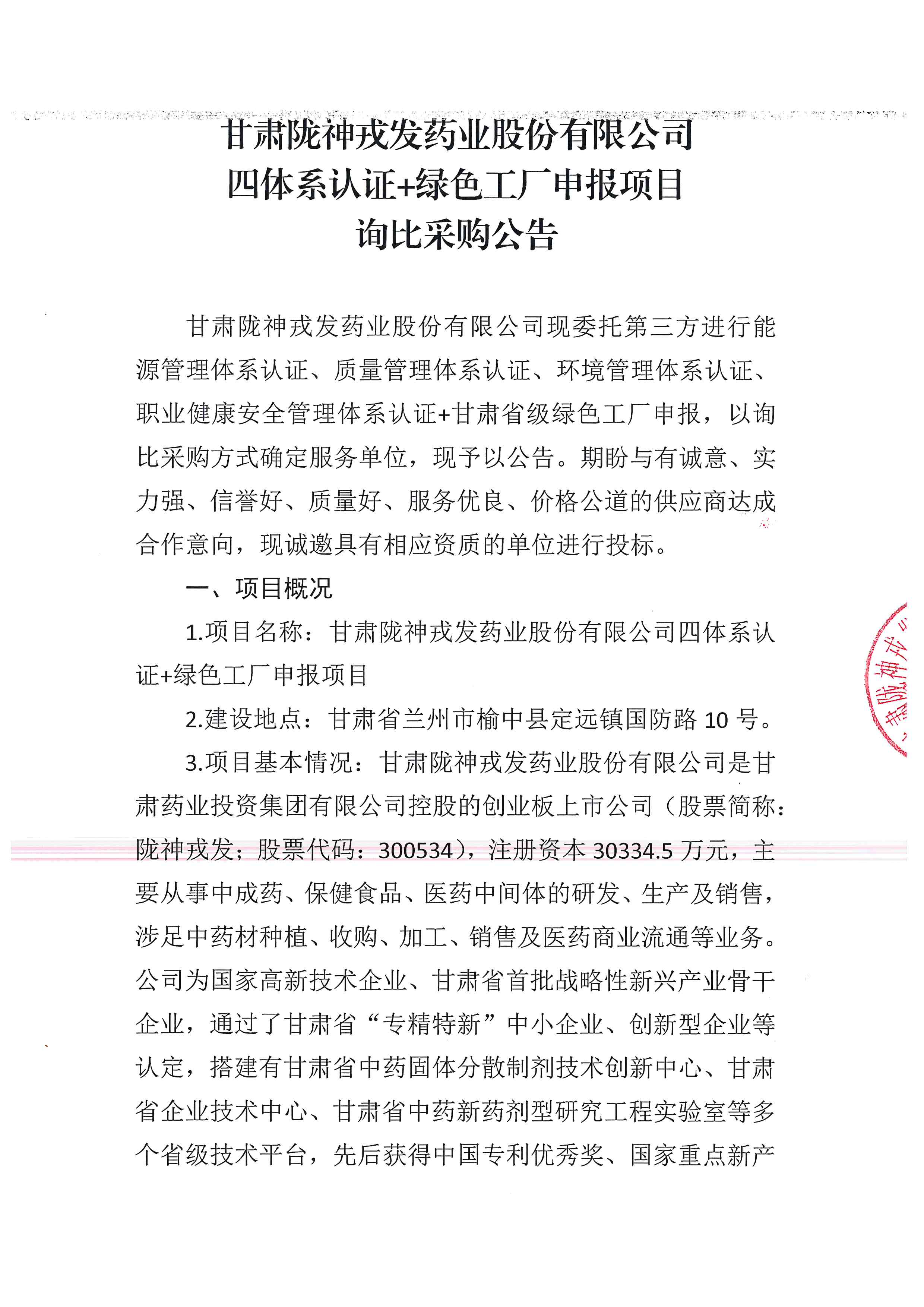 甘肅隴神戎發(fā)藥業(yè)股份有限公司四體系認證+綠色工廠申報項目詢比采購公告