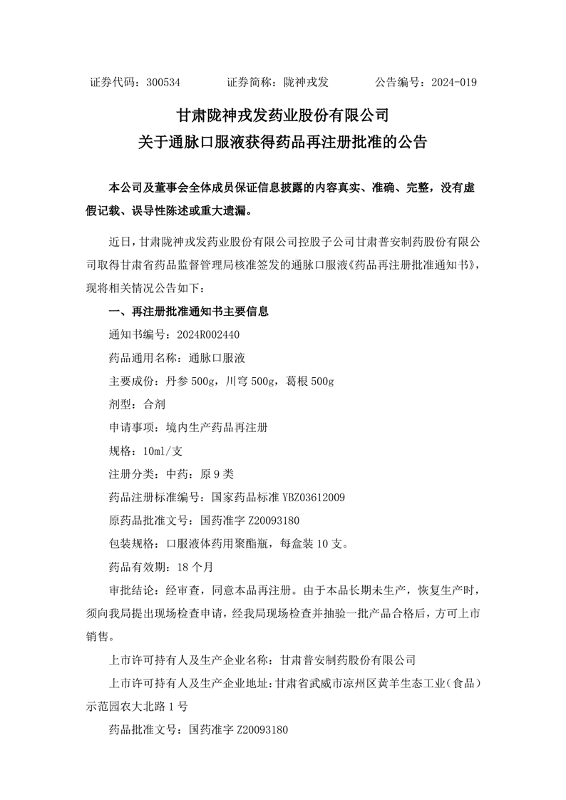關(guān)于通脈口服液獲得藥品再注冊批準(zhǔn)的公告